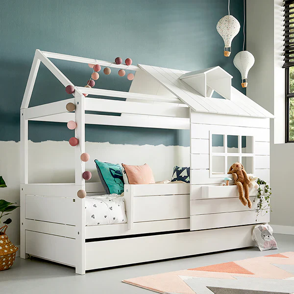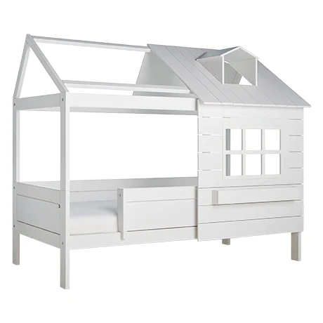Un lit cabane cool avec un look de maison de vacances. Ici, je me sens comme chez moi ou peut-être en vacances. Il délivre un espace cosy pour jouer, dormir et se détendre..