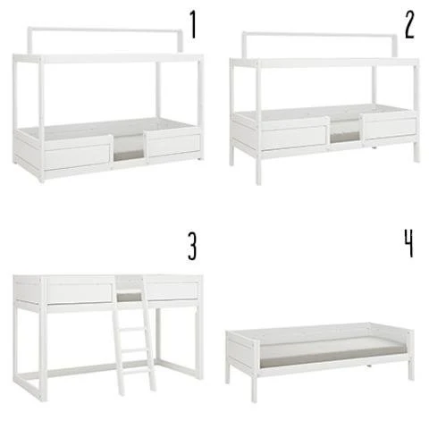 Le lit 4 en 1 est un concept où vous pouvez configurer le lit avec toutes les pièces en 4 variantes différentes et ainsi l’adapter à l’enfant d’un jeune âge à un jeune adolescent.