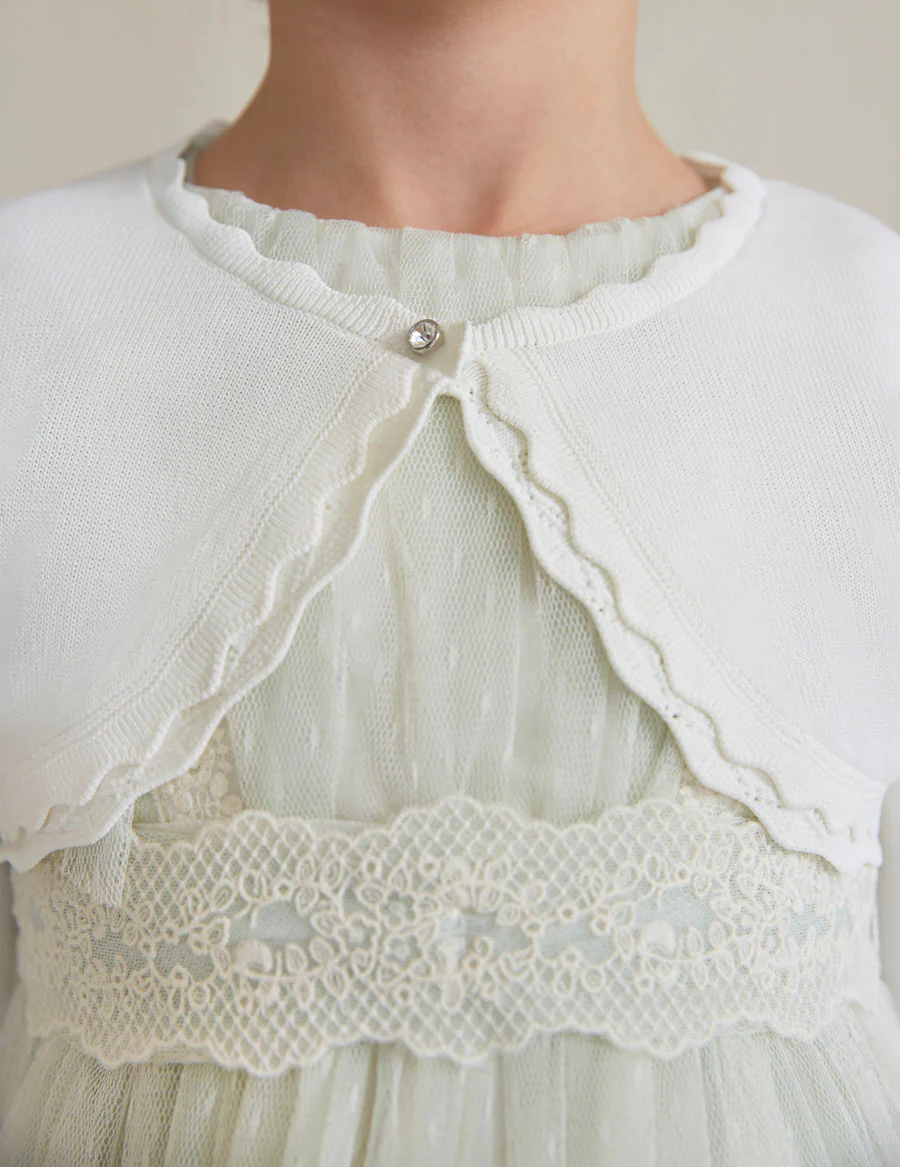 Magnifique cardigan en maille unie à bouts ondulés. Fermeture à bouton unique sur le devant. Un design original, idéal pour compléter un look parfait.