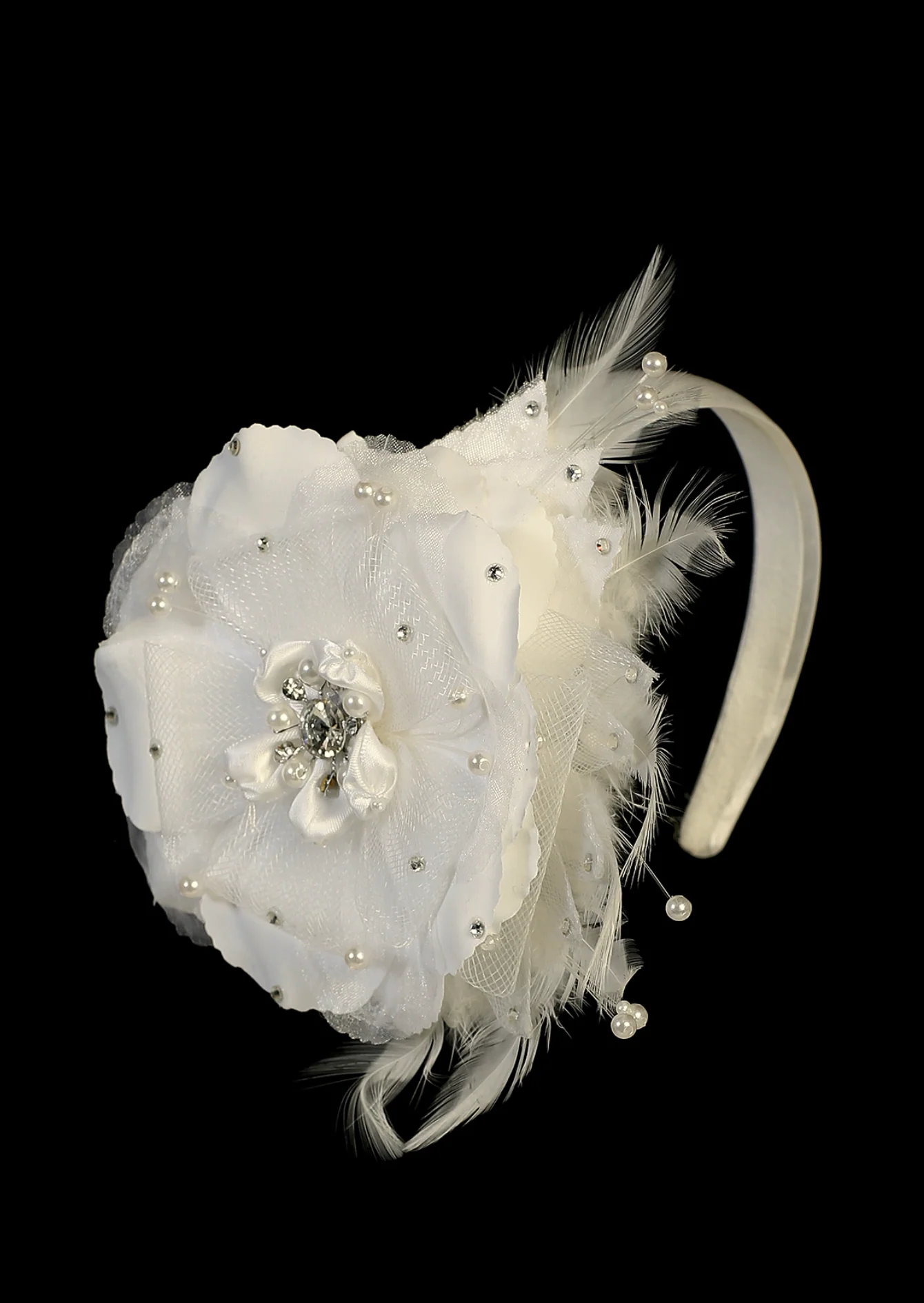 Bandeau avec de belles fleurs et strass, perles et plumes sur un bandeau en satin brillant. Taille unique.