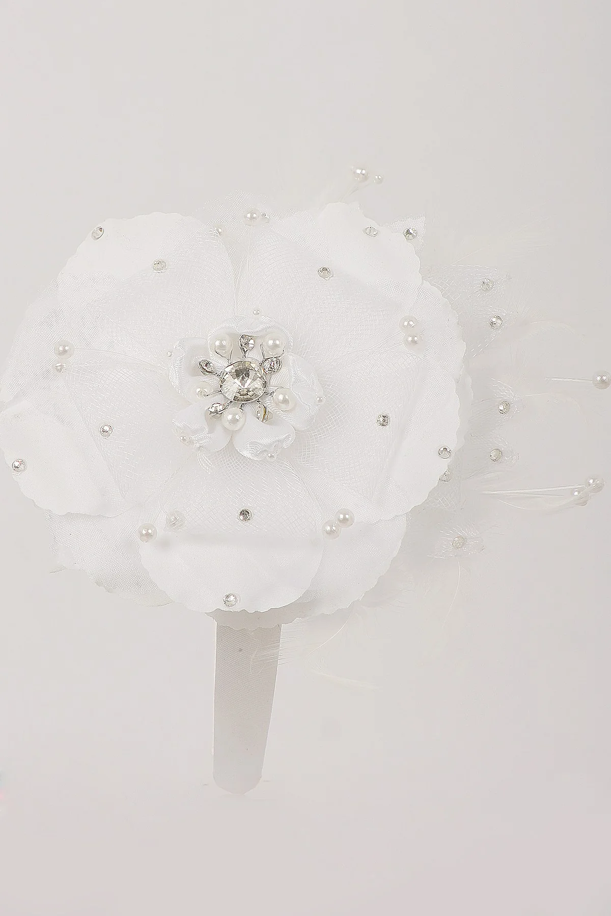 Bandeau avec de belles fleurs et strass, perles et plumes sur un bandeau en satin brillant. Taille unique. Numéro d’article : KD-HB038Couleur: blanc