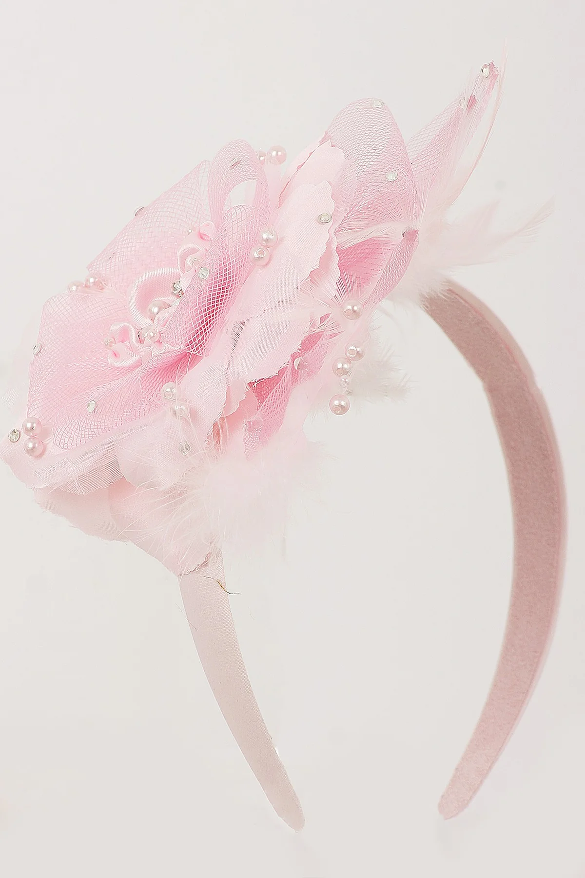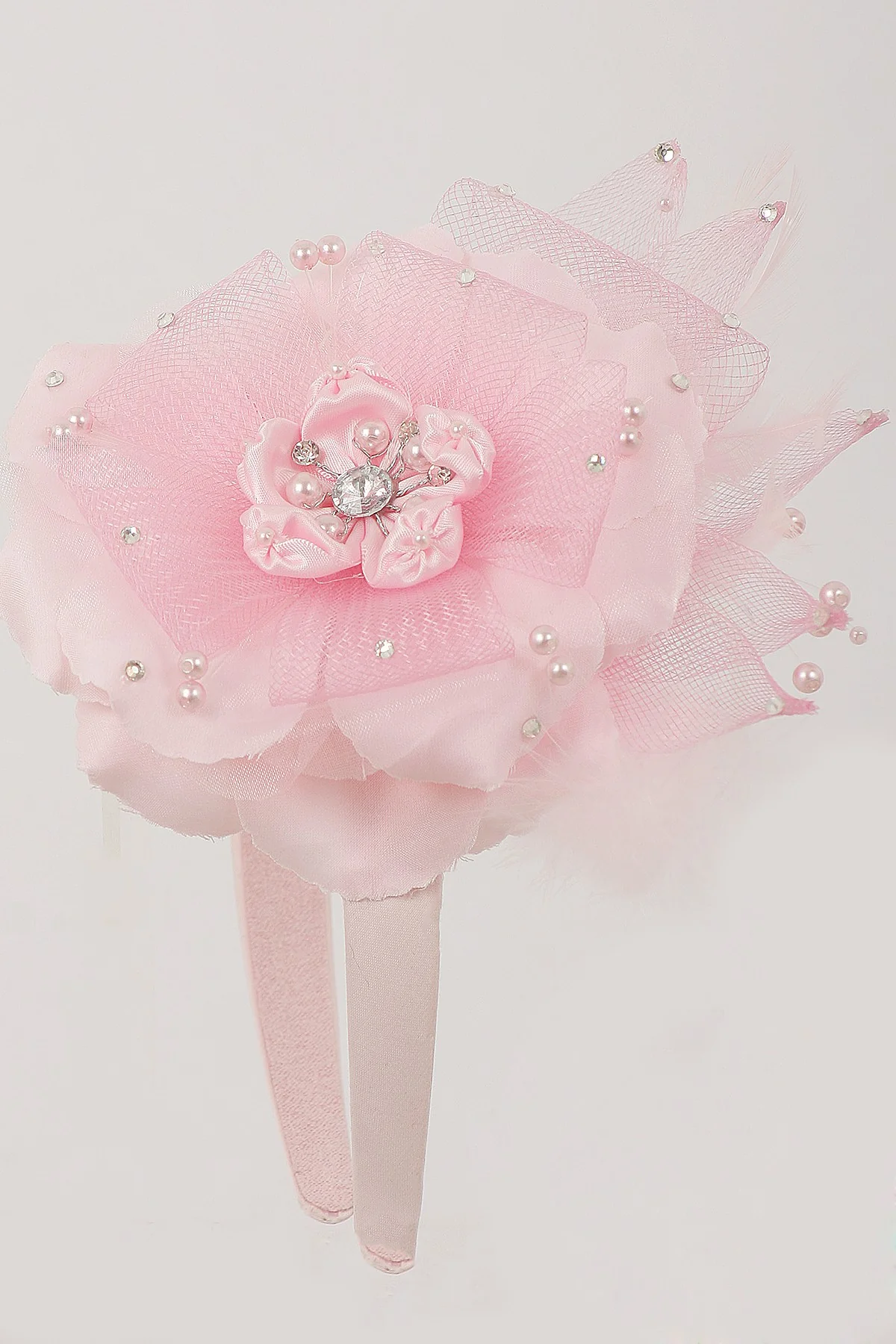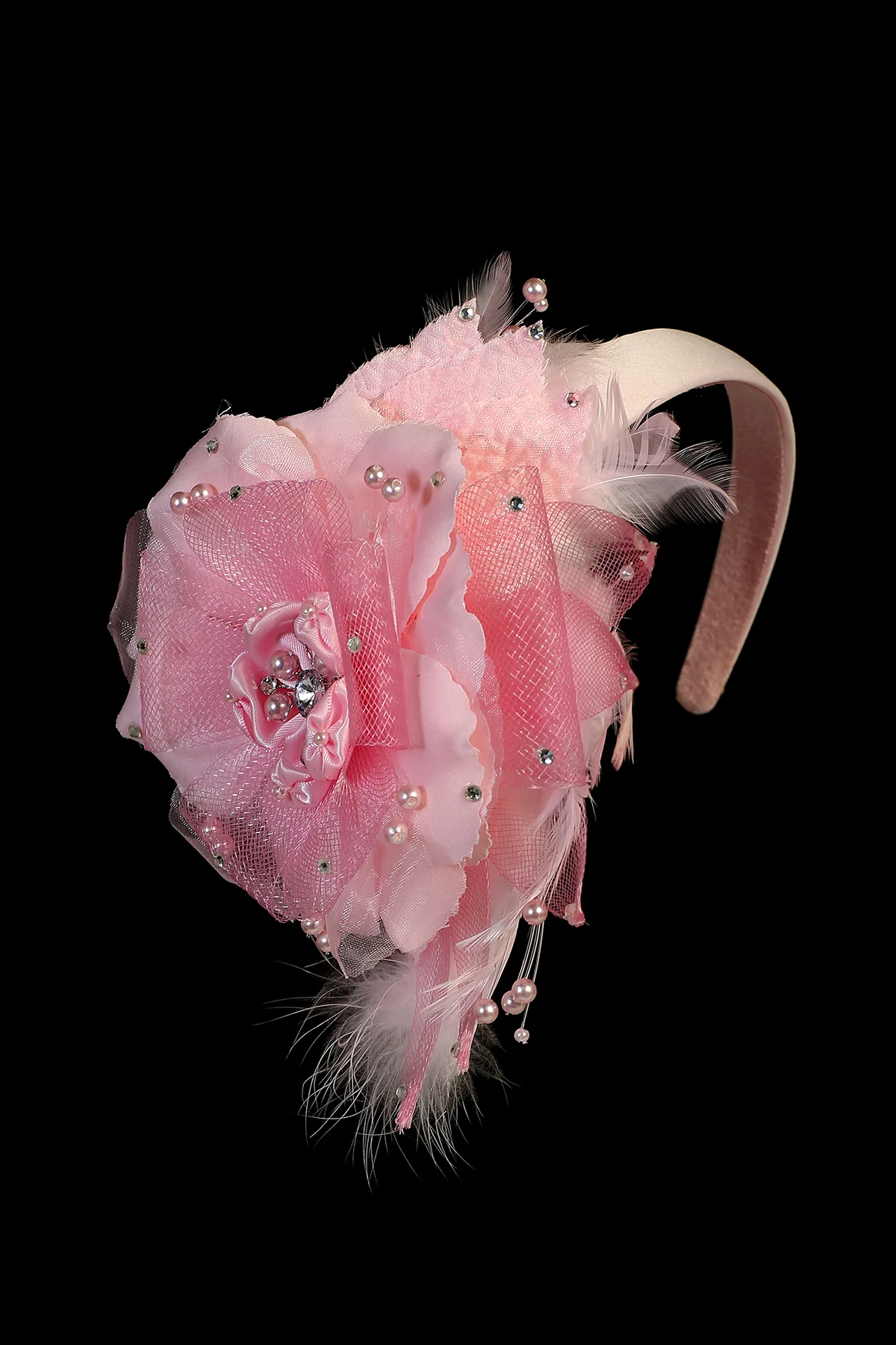 Bandeau avec de belles fleurs et strass, perles et plumes sur un bandeau en satin brillant. Taille unique. Numéro d’article : KD-HB038Couleur: rose