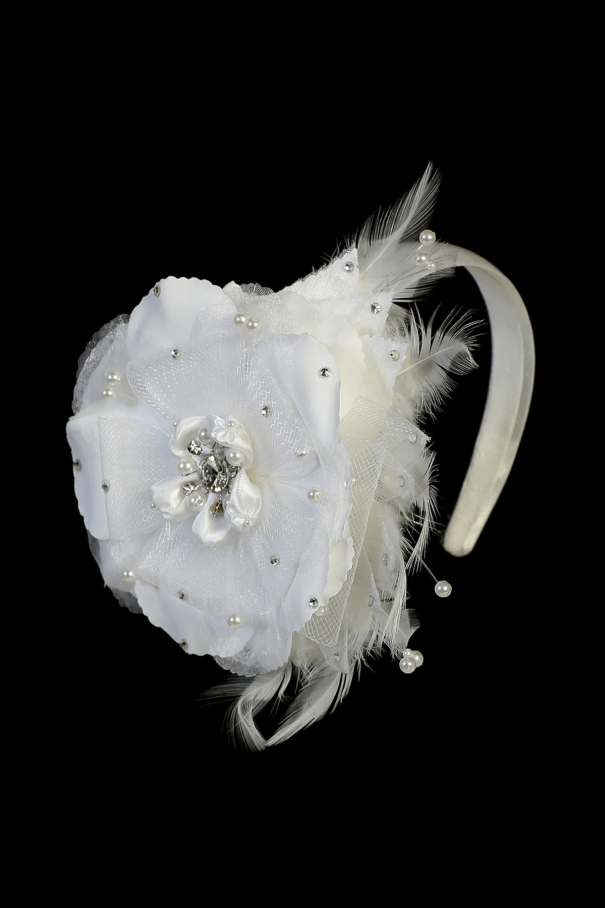 Bandeau avec de belles fleurs et strass, perles et plumes sur un bandeau en satin brillant. Taille unique.