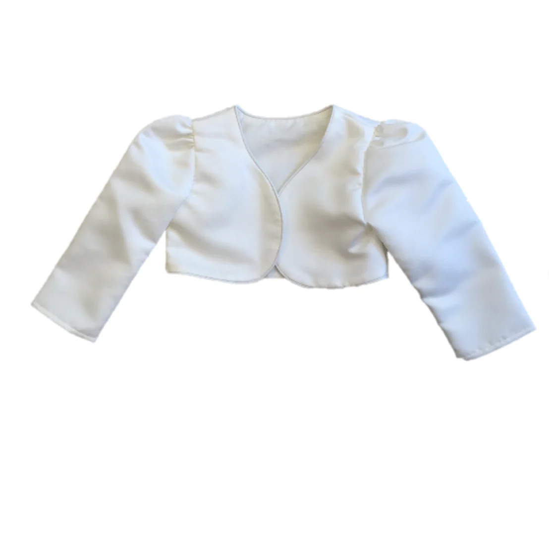 Joli boléro en satin beige clair. Er peut être porté sur une robe de soirée ainsi qu’en combinaison avec une robe de baptême.