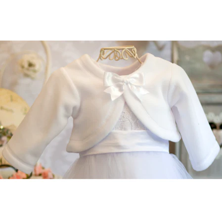 Cet élégant boléro Felicia en molleton doux est très agréable à porter. Il se ferme en haut par un ruban de satin. Couleur: blanc