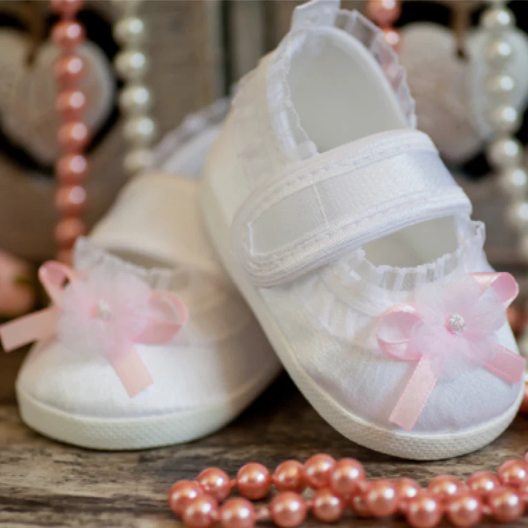 Ravissants souliers de baptême pour filles en satin, bordés de dentelle et ornés d’un ravissant nœud papillon. Le modèle est disponible en blanc. Les chaussures de baptême sont pratiquement fermées par une fermeture velcro et ont une semelle antidérapante.