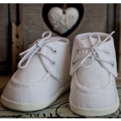 Charmantes chaussures en velours côtelé pour garçon. Le modèle est disponible en blanc. Les chaussures sont fermées par des lacets et ont des semelles antidérapantes.