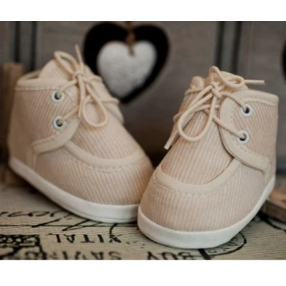 Charmantes chaussures en velours côtelé pour garçon. Le modèle est disponible en blanc. Les chaussures sont fermées par des lacets et ont des semelles antidérapantes.