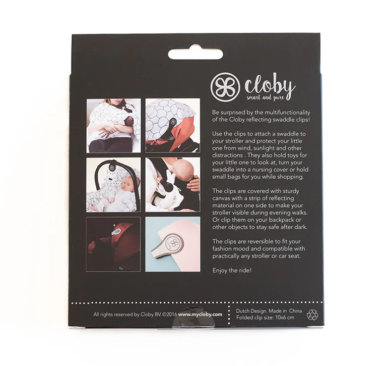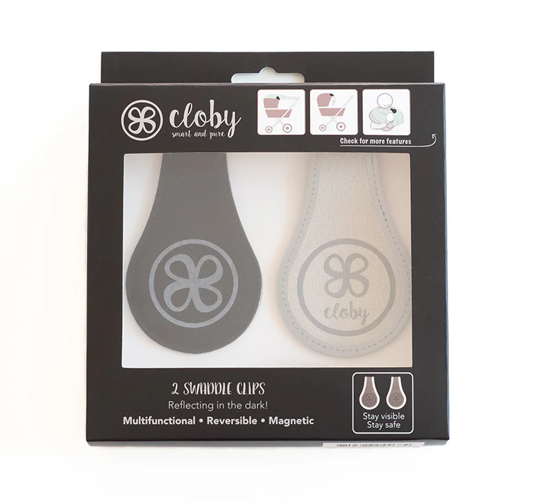 Les Clips Cloby pratiques sont multifonctionnels et aident à de nombreuses occasions ! Le clip contient 2 aimants et est réversible. Ils attachent des jouets, des couvertures ou des petits sacs à la poussette ou au siège auto, fixent la couche comme doublure ou bavoir, etc.