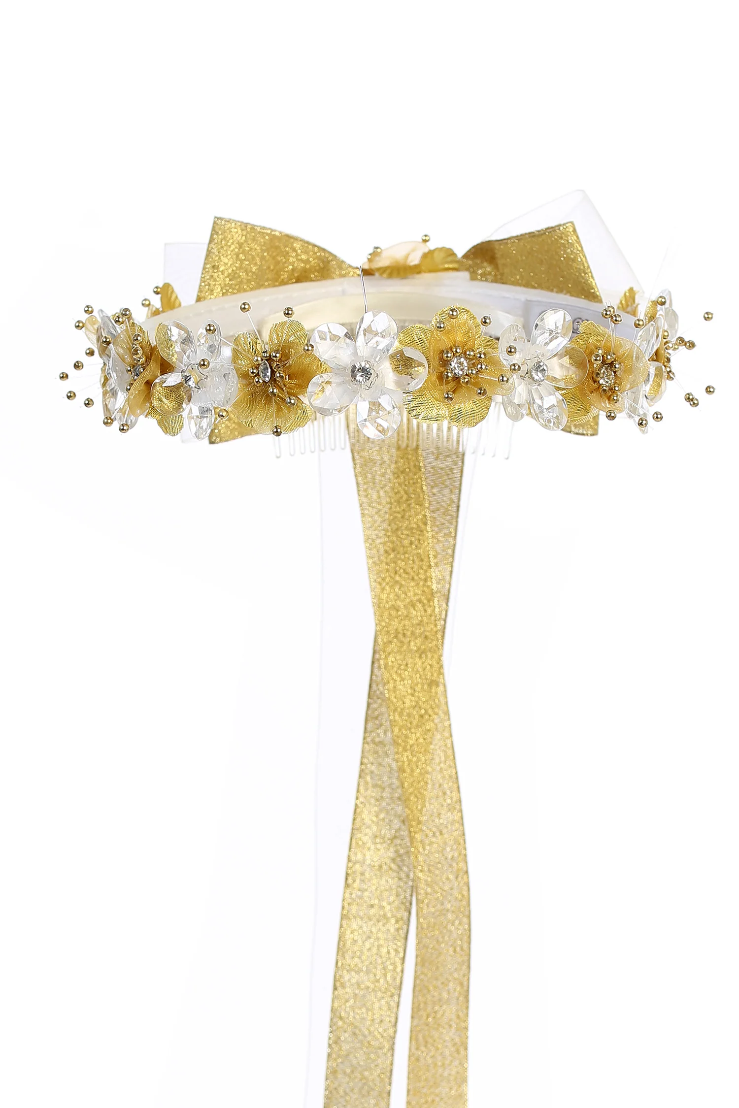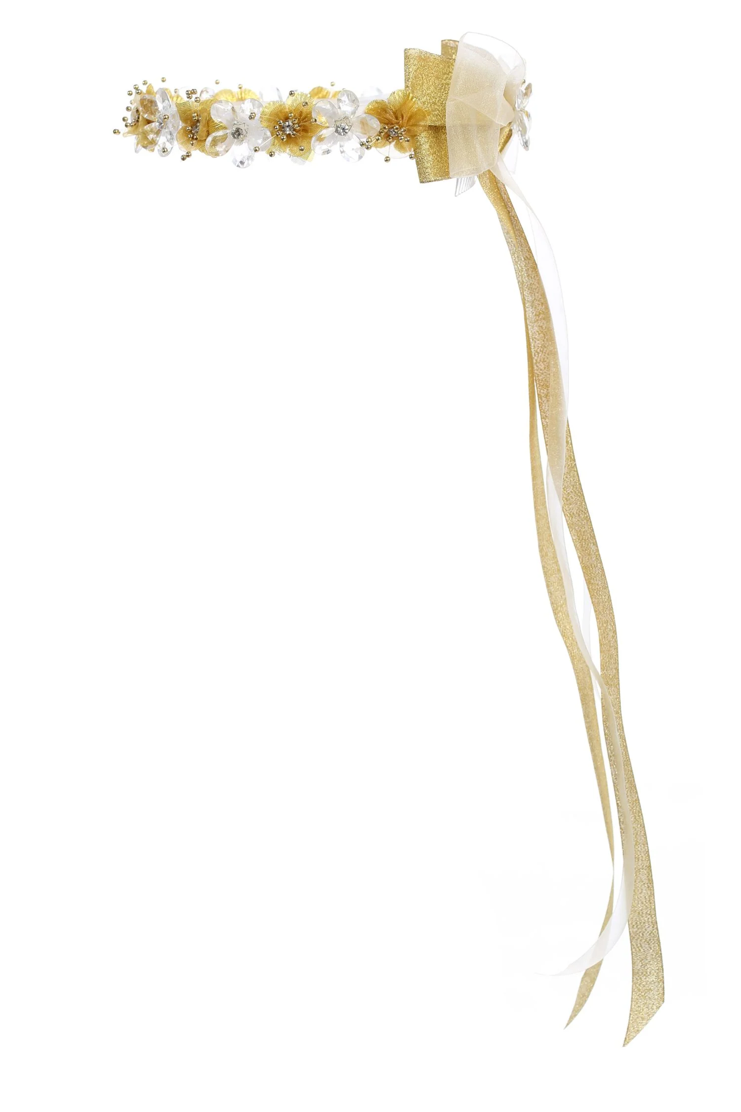 Charmante couronne de fleurs pour cheveux faite de strass et de cristaux en or. Livré avec un nœud à l’arrière et un peigne pour maintenir la couronne en place. Taille unique.
