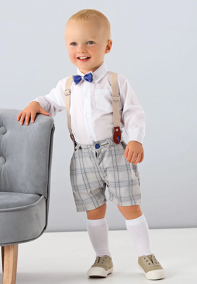 Ce charmant costume très élégant se compose d’un pantalon court à carreaux, d’une chemise en coton, d’un nœud papillon et de bretelles. Il impressionne par la grande coupe. L’ensemble est fait d’un matériau doux.