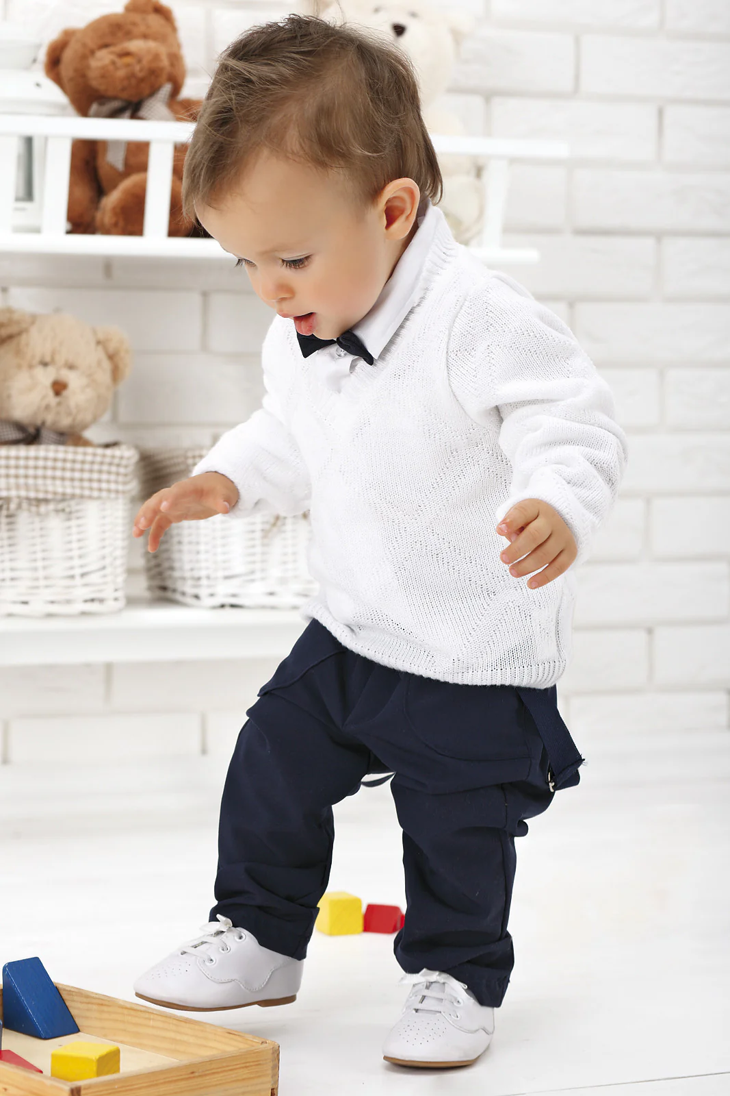 Cet ensemble adorable et chic se compose d’un pantalon, d’une chemise, d’un cardigan et d’un nœud papillon. Il impressionne par sa grande coupe. Très bien fini. Cet ensemble est tout simplement un eye-catcher! Couleur : blanc-marine Inclus dans la livraison : pantalon, chemise, cardigan, nœud papillon Numéro d’article : SK-WA025