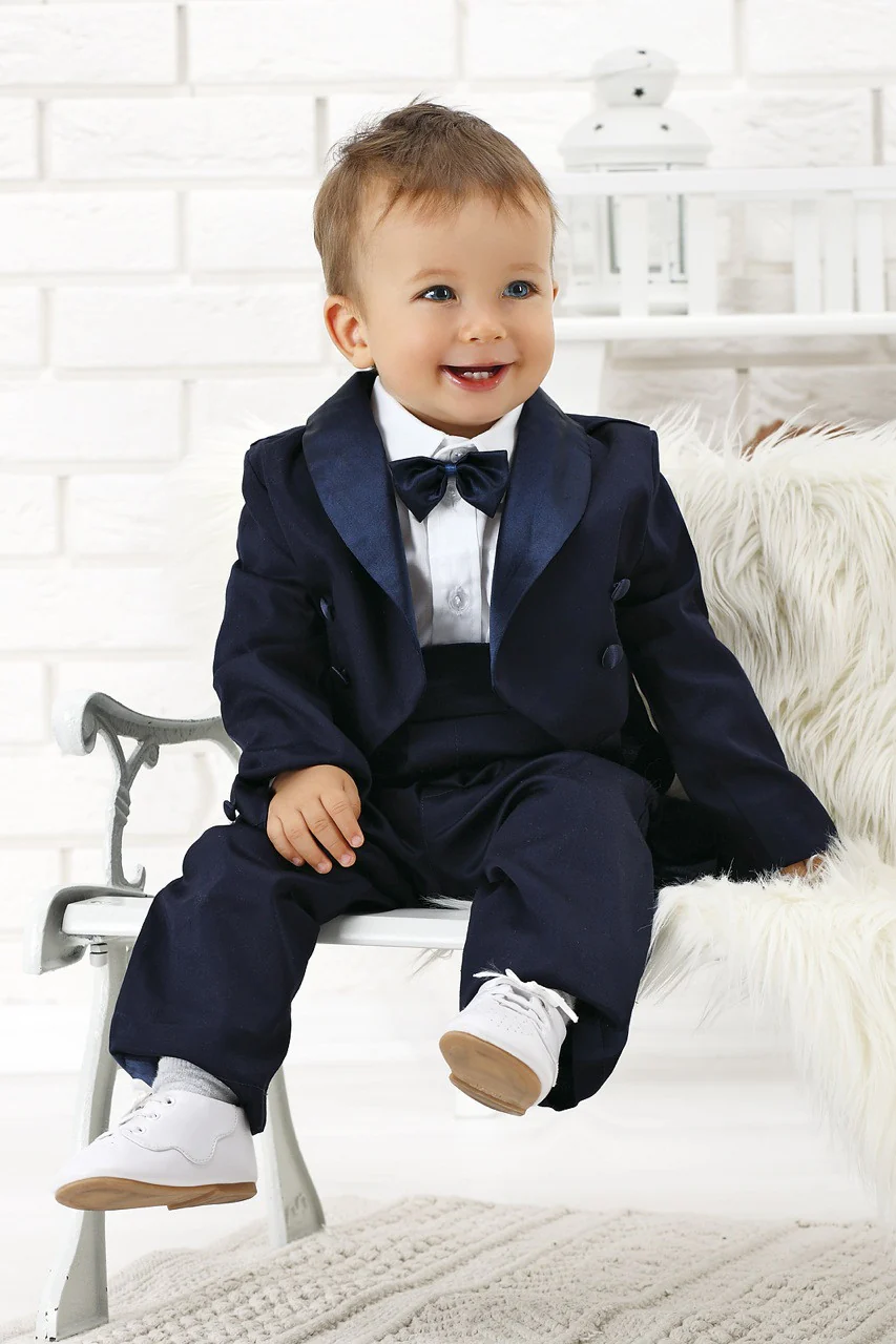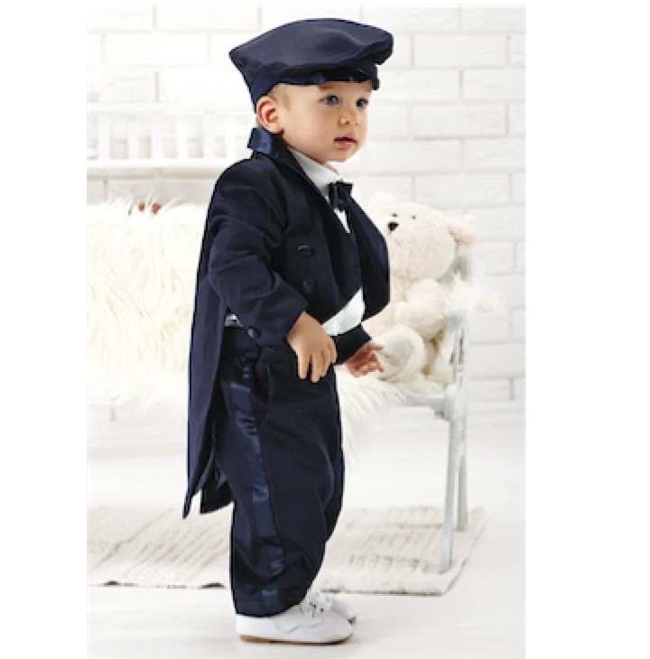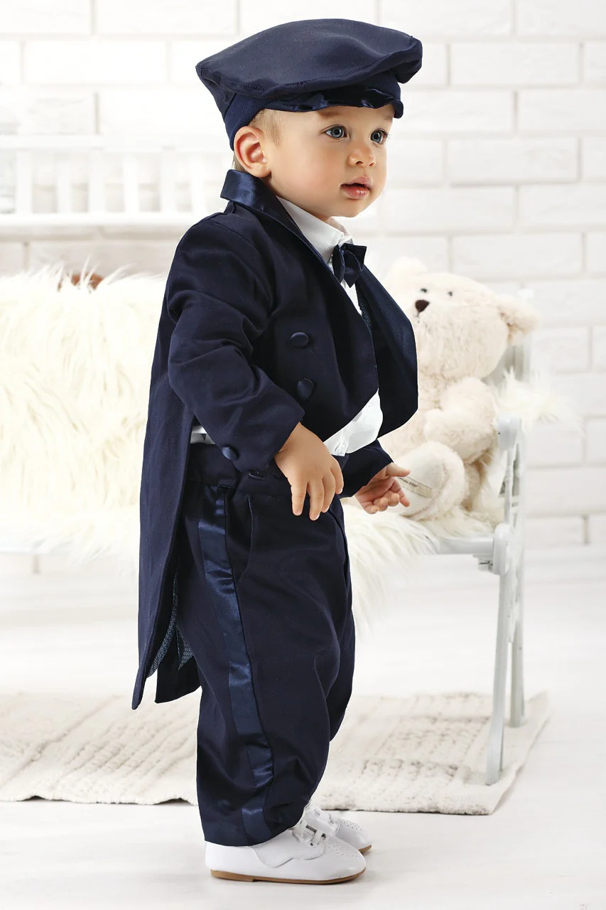 Ce charmant ensemble queue-de-pie très élégant se compose d’un pantalon, d’une chemise en coton, d’un nœud papillon, d’une veste queue-de-pie et d’une casquette. Il impressionne par la grande coupe. Très belle finition avec un empiècement en satin sur les revers.