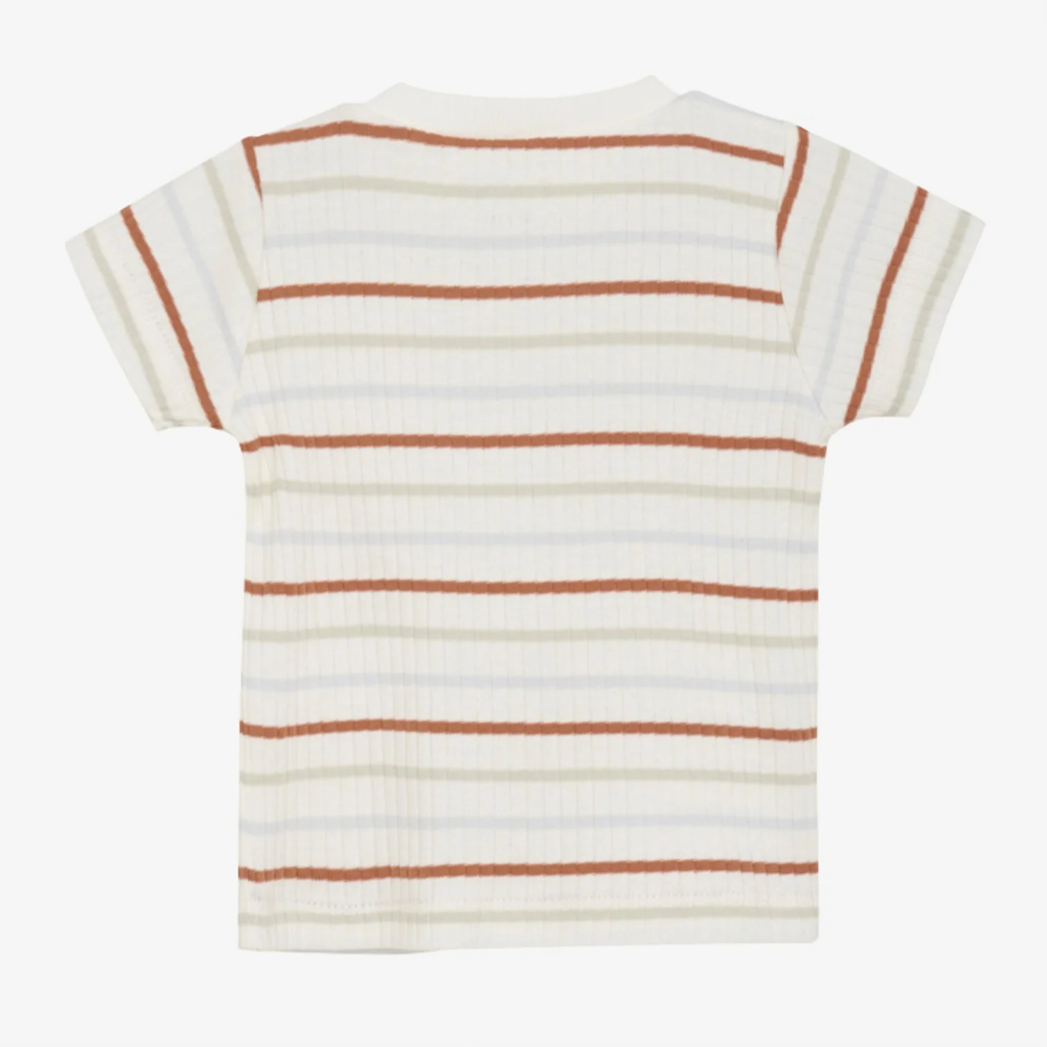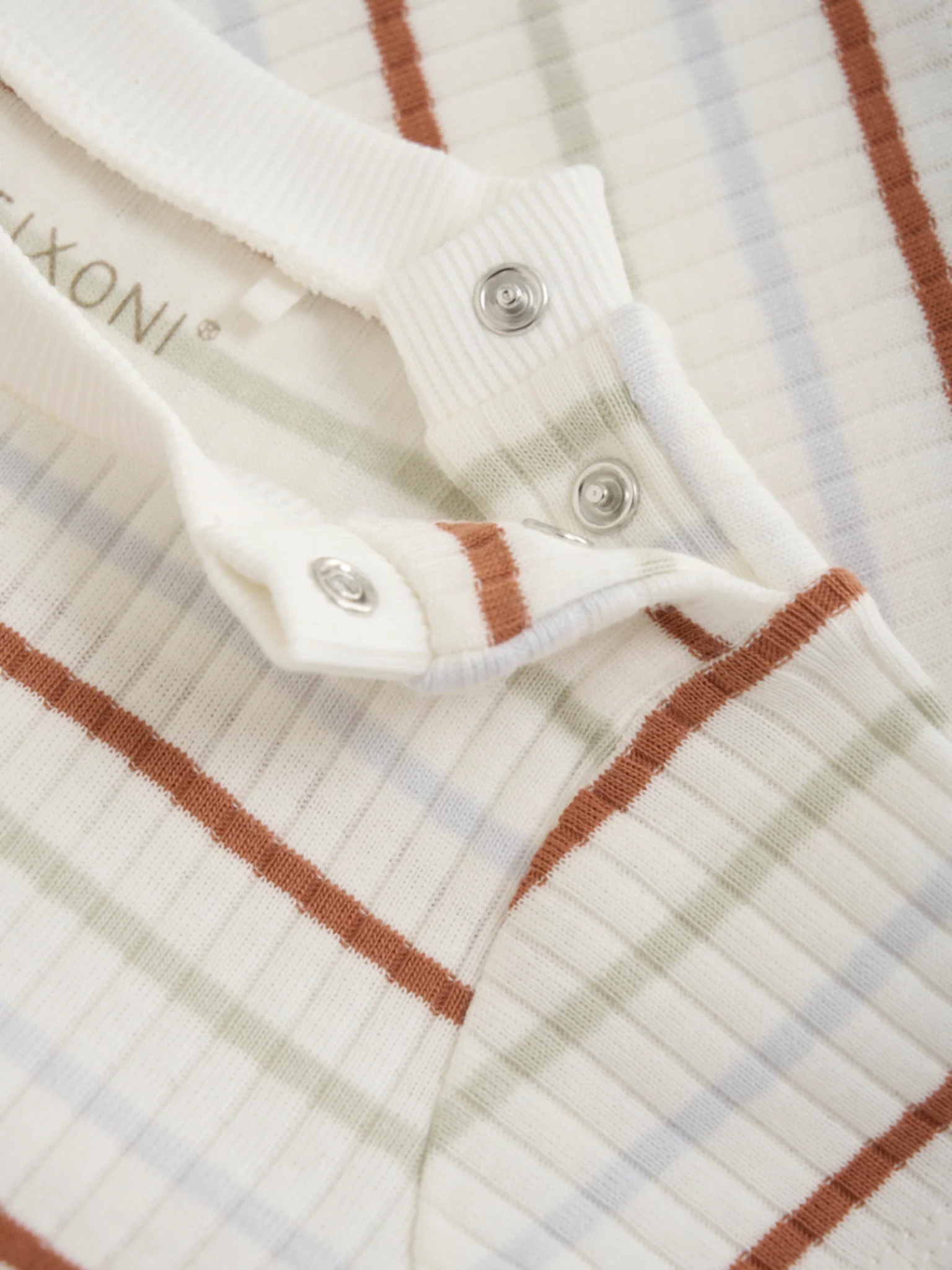 Adorable t-shirt rayé de Fixoni. Se ferme sur une épaule grâce à des boutons-pression pratiques. En coton biologique certifié de qualité côtelée de haute qualité et avec une finition côtelée au niveau de l’encolure. Conforme aux normes GOTS et OEKO-TEX® STANDARD 100. Pour plus de durabilité et de qualité.