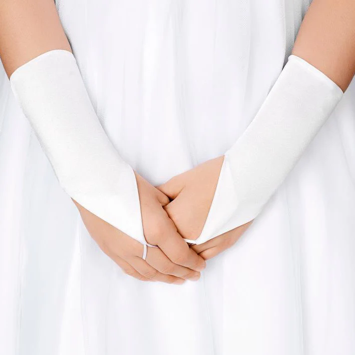 Ces adorables gants en satin blanc sont l’accessoire parfait pour une demoiselle d’honneur ou pour une communion.