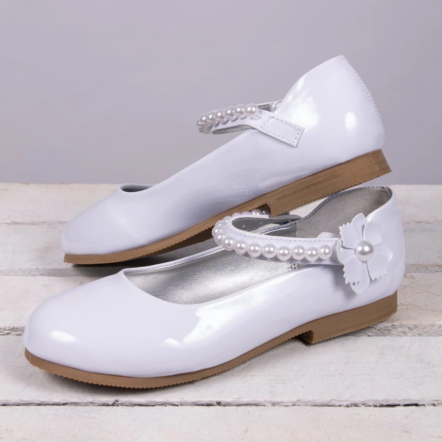 Ces ballerines confortables Lia en blanc avec une ravissante décoration de perles et une semelle en caoutchouc confortable font rêver les petites filles.