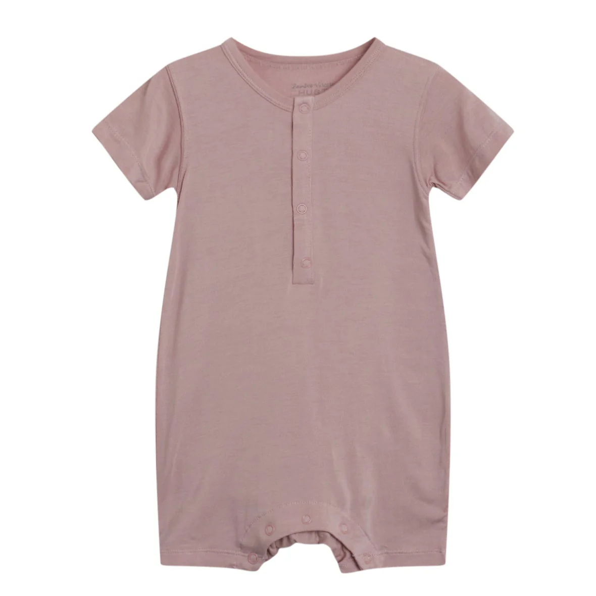 Combinaison bouffante à manches courtes en jersey de bambou extensible avec patte de boutonnage sur le devant et jambes de pantalon élastiquées. Boutonné entre les jambes. Ce produit est certifié Oeko-Tex 100®.