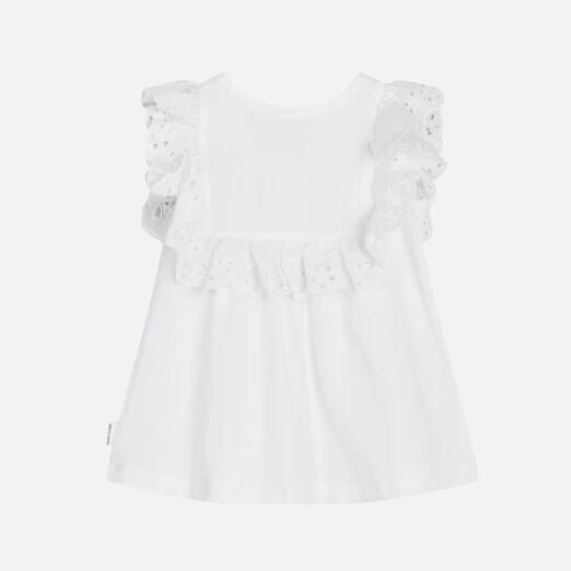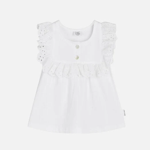 T-shirt à manches courtes avec broderie à volants allant des épaules à la poitrine. Fermeture boutonnée centrale devant. Ce produit est composé à 95% de coton biologique.