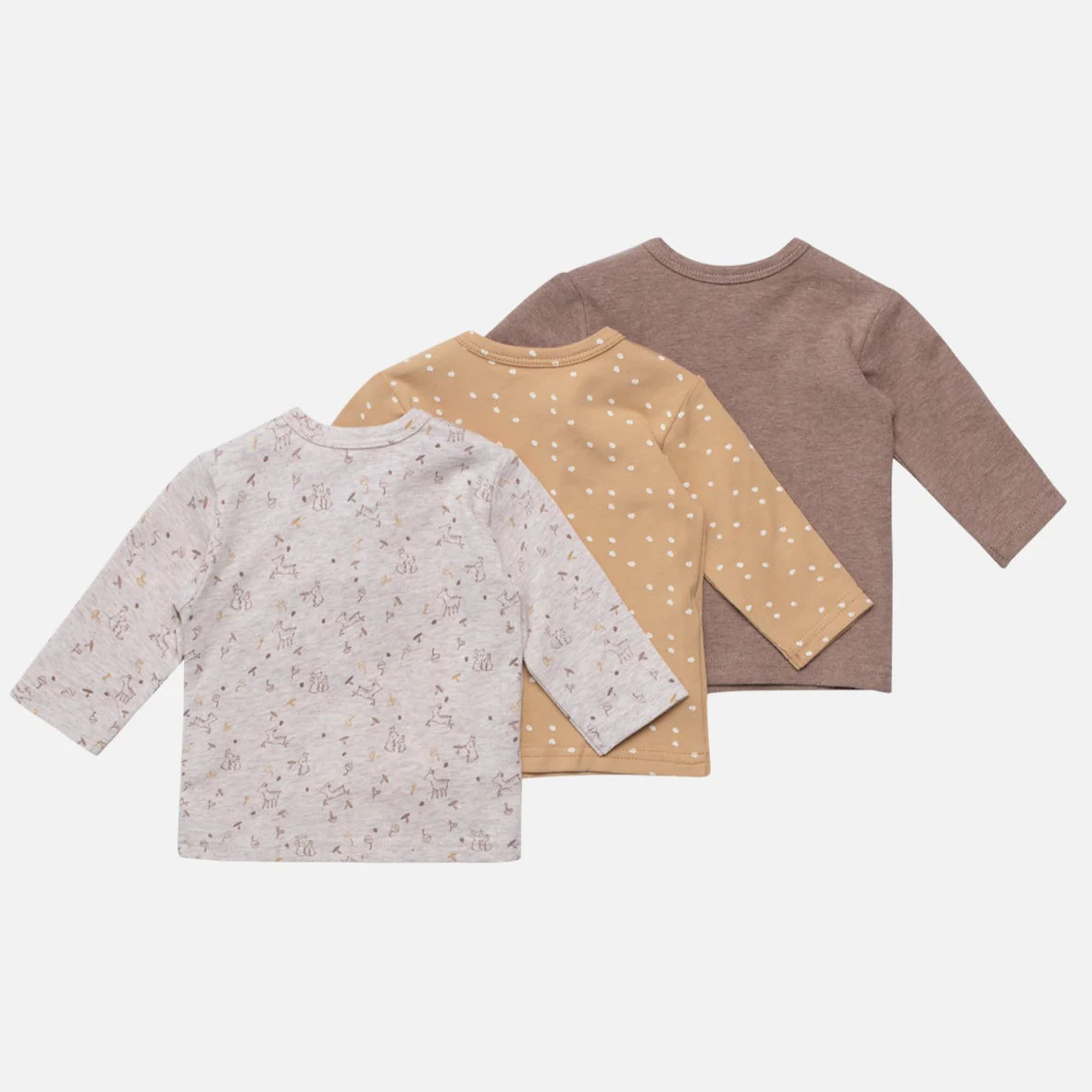 3 t-shirts à manches longues en jersey de coton stretch déclinés en 3 motifs différents. L’un a un imprimé floral, un autre à pois et le troisième a un imprimé animalier sur le devant. Tous les 3 ont des pressions sur les épaules.