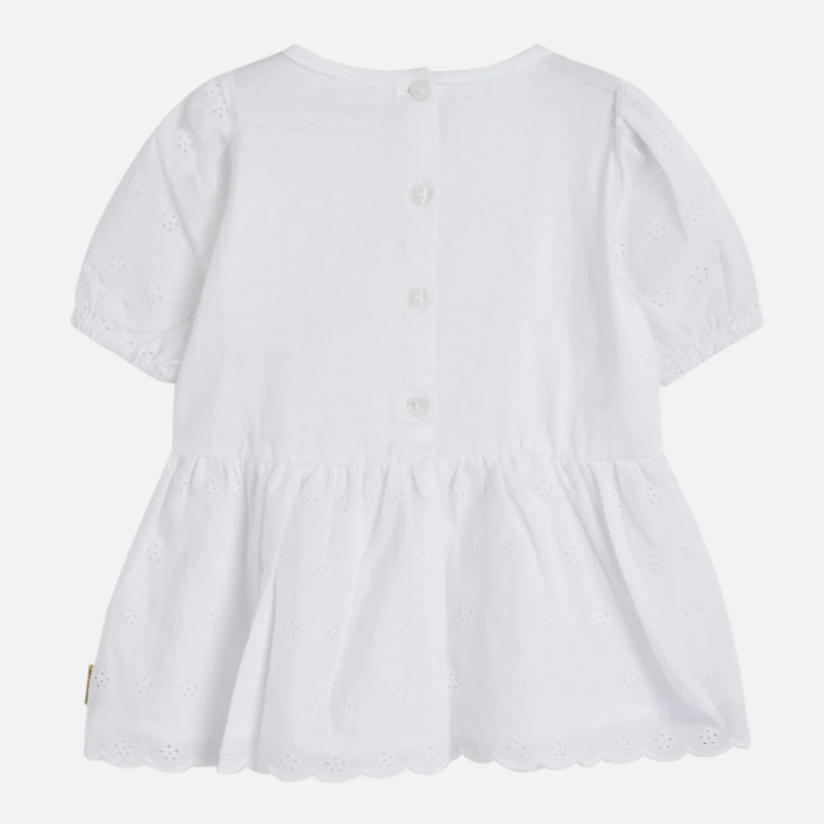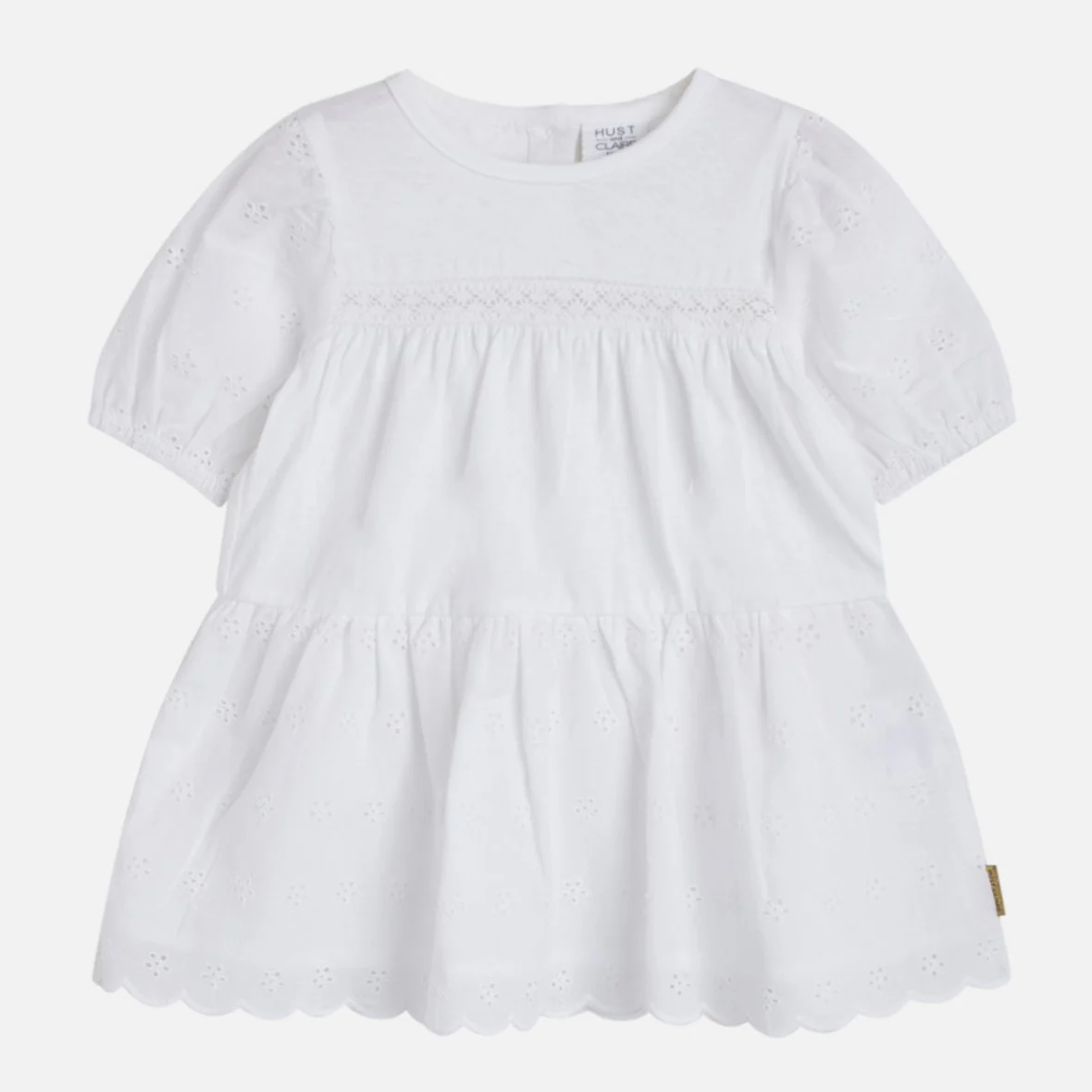 Robe à motif pointelle et détails brodés. La robe a des volants sur les épaules, des manches élastiquées et des lignes de volants sur le corps qui créent beaucoup d’espace. boutons à l’arrière du cou. Ce produit est composé à 100% de coton biologique.