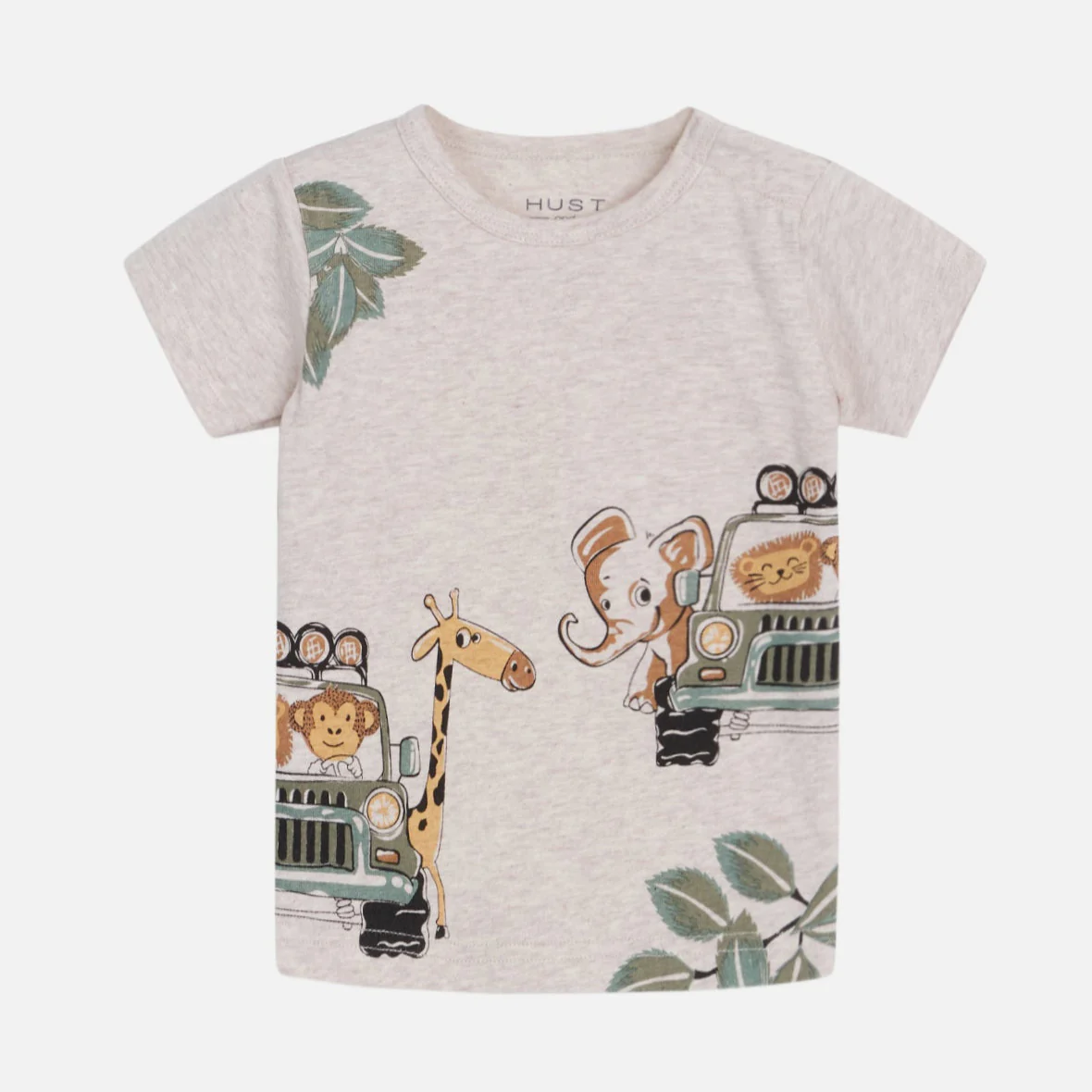 T-shirt en coton doux avec imprimé jeep, animal et feuille. Fermeture à bouton-pression sur l’épaule gauche. Ce produit est certifié GOTS (Global Organic Textile Standard).