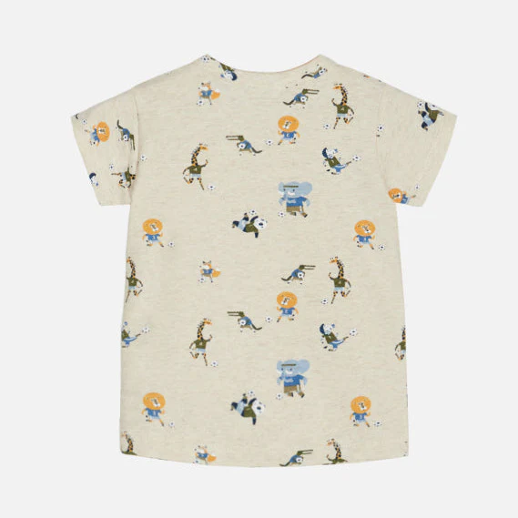 T-shirt en coton doux avec un imprimé représentant des animaux jouant au football et une poche poitrine sur la poitrine gauche. Ce produit est certifié GOTS (Global Organic Textile Standard).