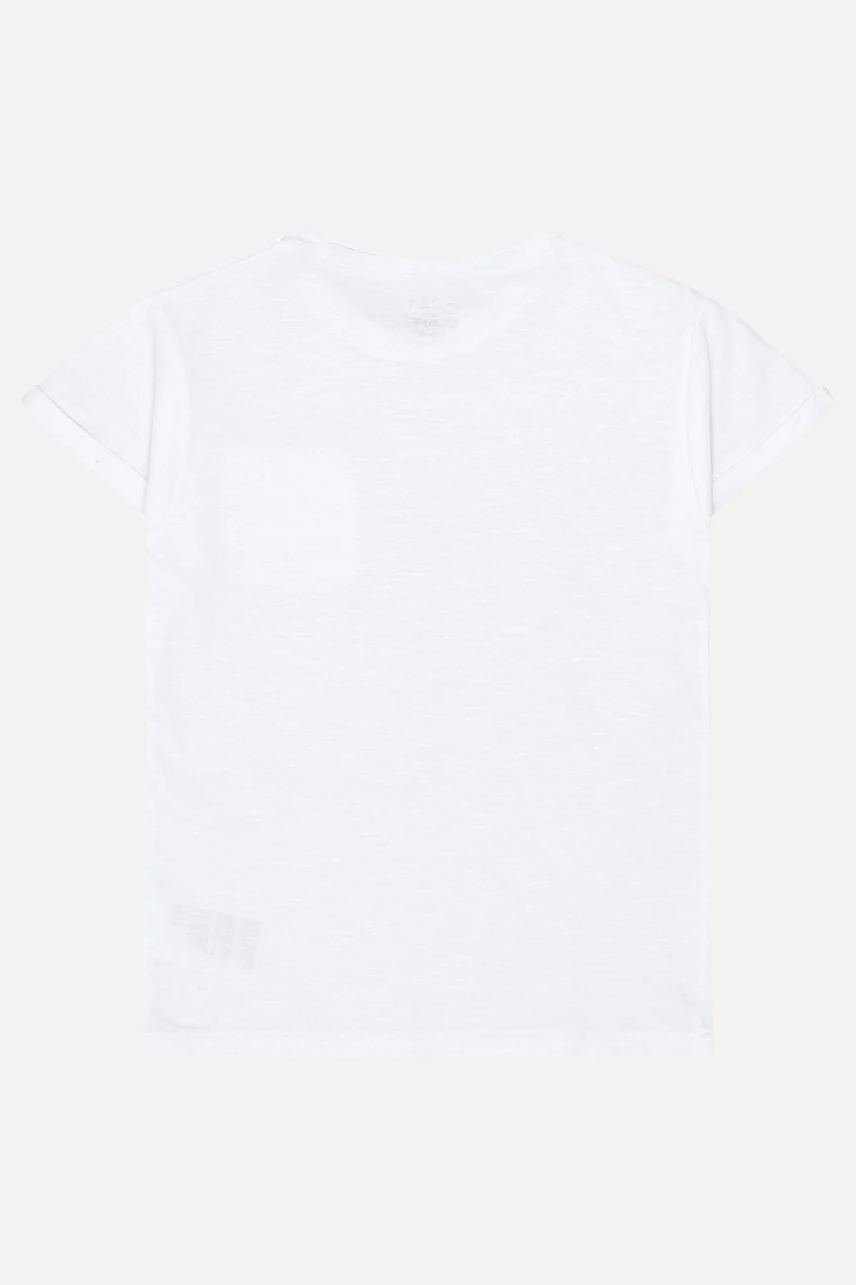 T-shirt basique cool en jersey flammé, avec une poche poitrine cool aux bords rugueux. Le t-shirt a des poignets sur les manches et des coutures grossières sur l’encolure et le bord inférieur.
