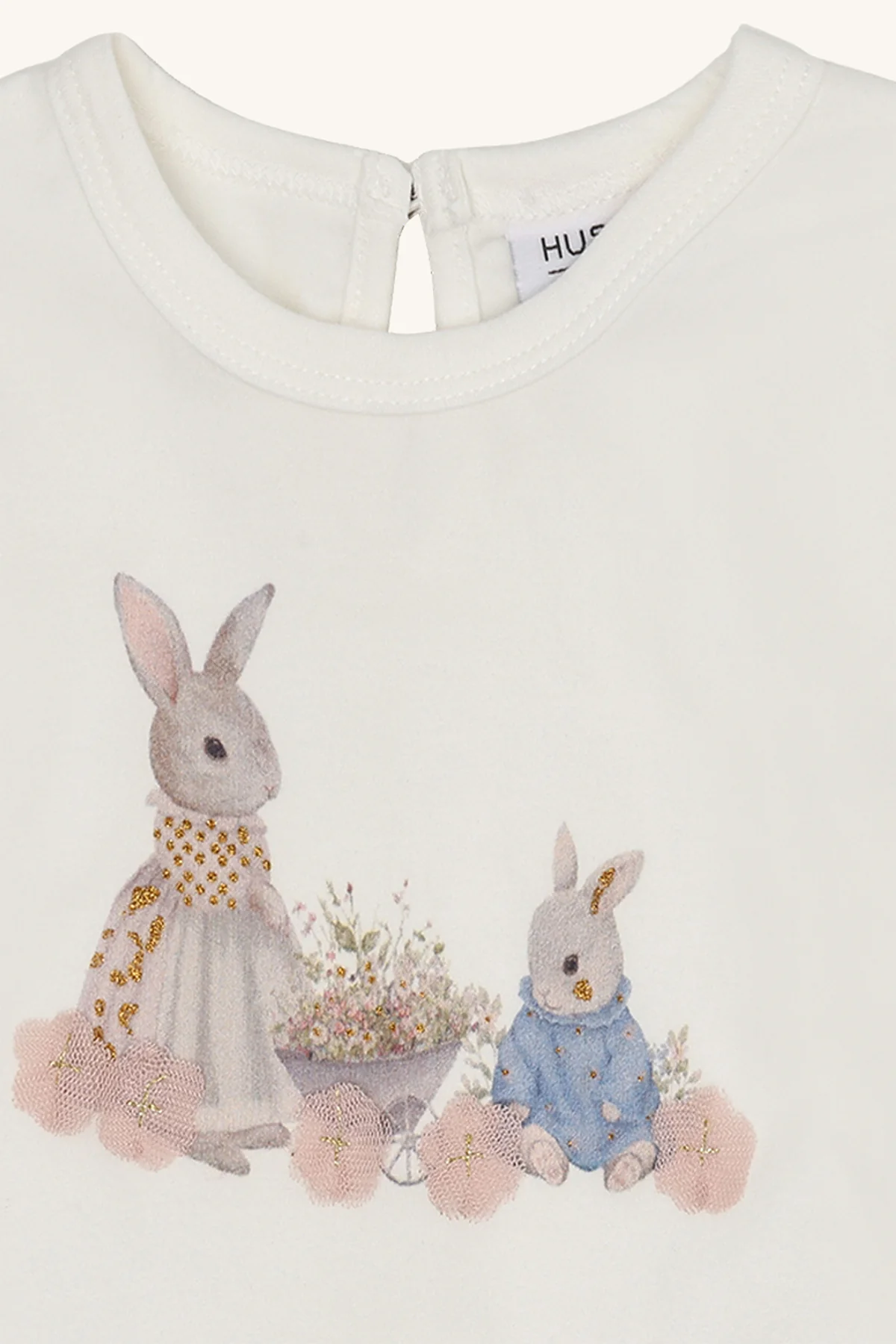 Ce t-shirt bébé à manches longues HUST & CLAIRE, en coton biologique doux, offre un confort optimal aux petites filles. Son imprimé, conçu avec soin, représente une maman lapin avec son enfant, soulignant le thème « Maman et moi ». Idéal pour la peau sensible des bébés, il allie durabilité et design élégant.