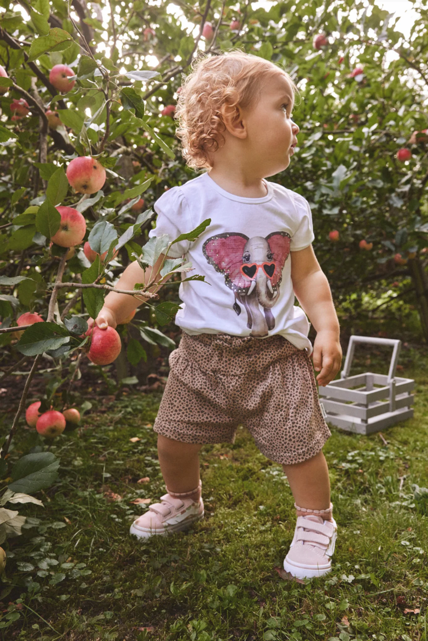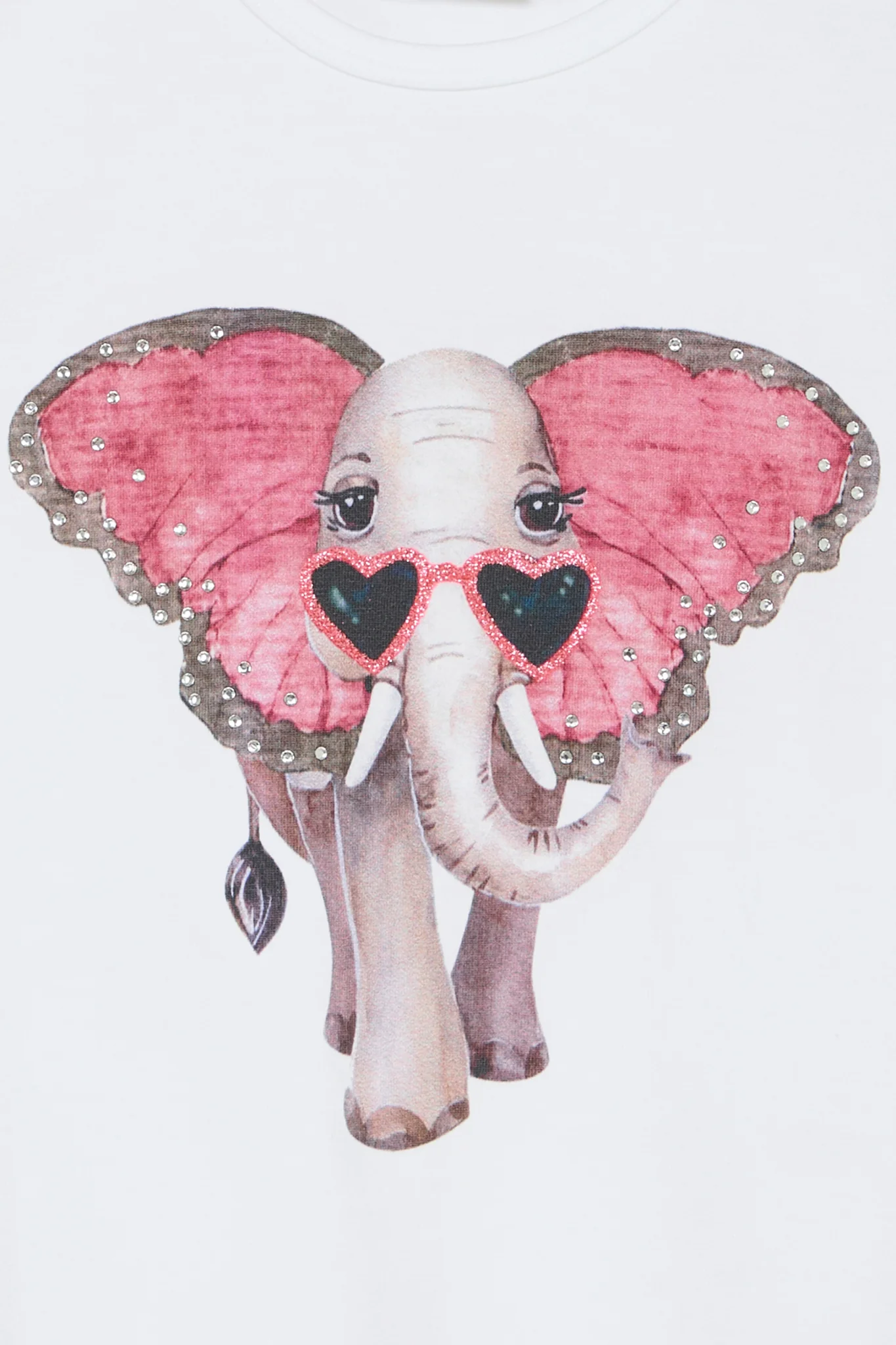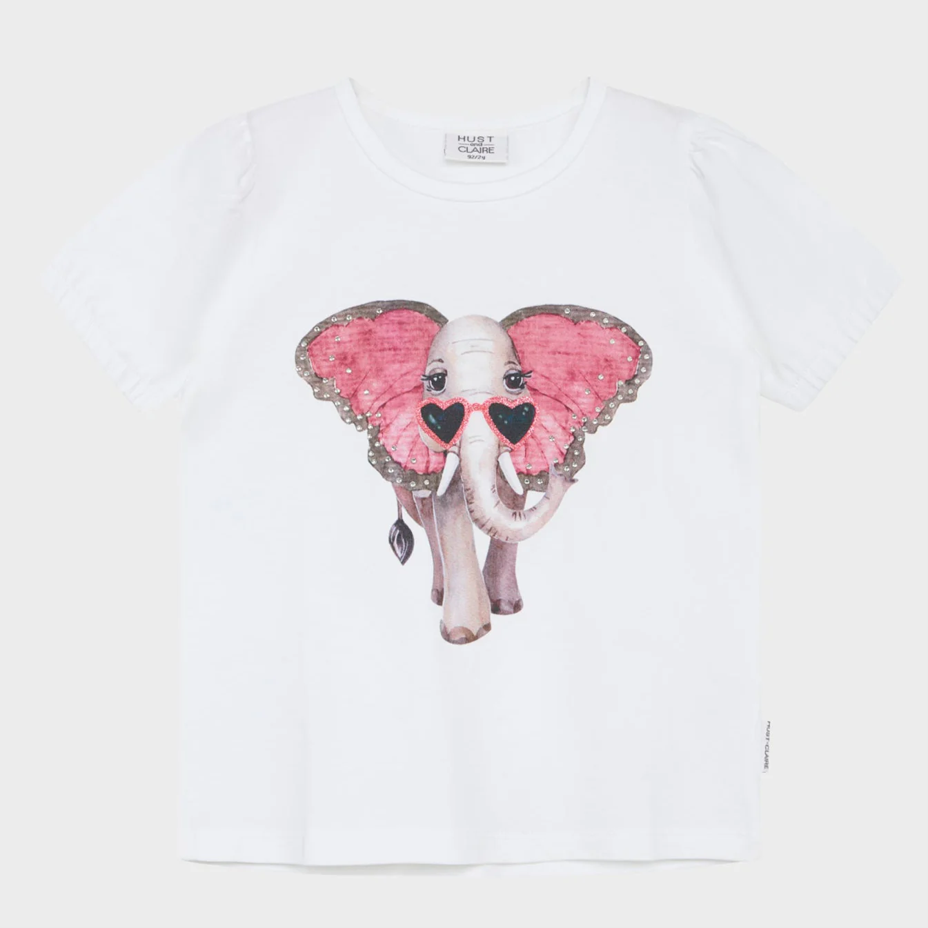 HUST & CLAIRE – T-shirt à manches courtes en coton biologique doux avec motif éléphant et détail plissé sur les épaules. Le motif éléphant est agrémenté de jolis détails comme des strass sur les oreilles et des paillettes sur les lunettes de soleil. Parfait pour un look confortable et élégant pour les petites filles.