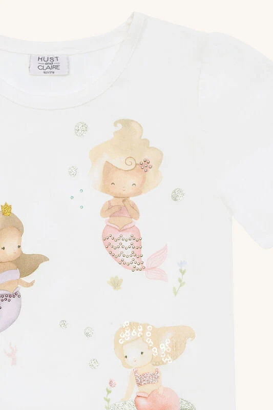 Découvrez le T-Shirt HUST & CLAIRE Mermaid HCAlma ! Ce t-shirt à manches courtes est confectionné en coton doux et extensible et présente de jolies fronces aux épaules. Les motifs sirène sur le devant sont décorés de paillettes, de strass et de paillettes. Profitez du confort et de la durabilité de ce T-shirt unique !