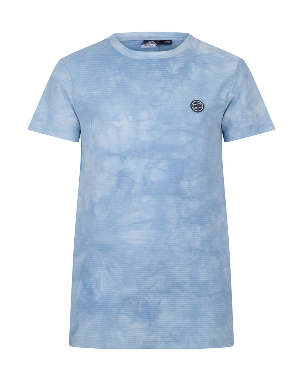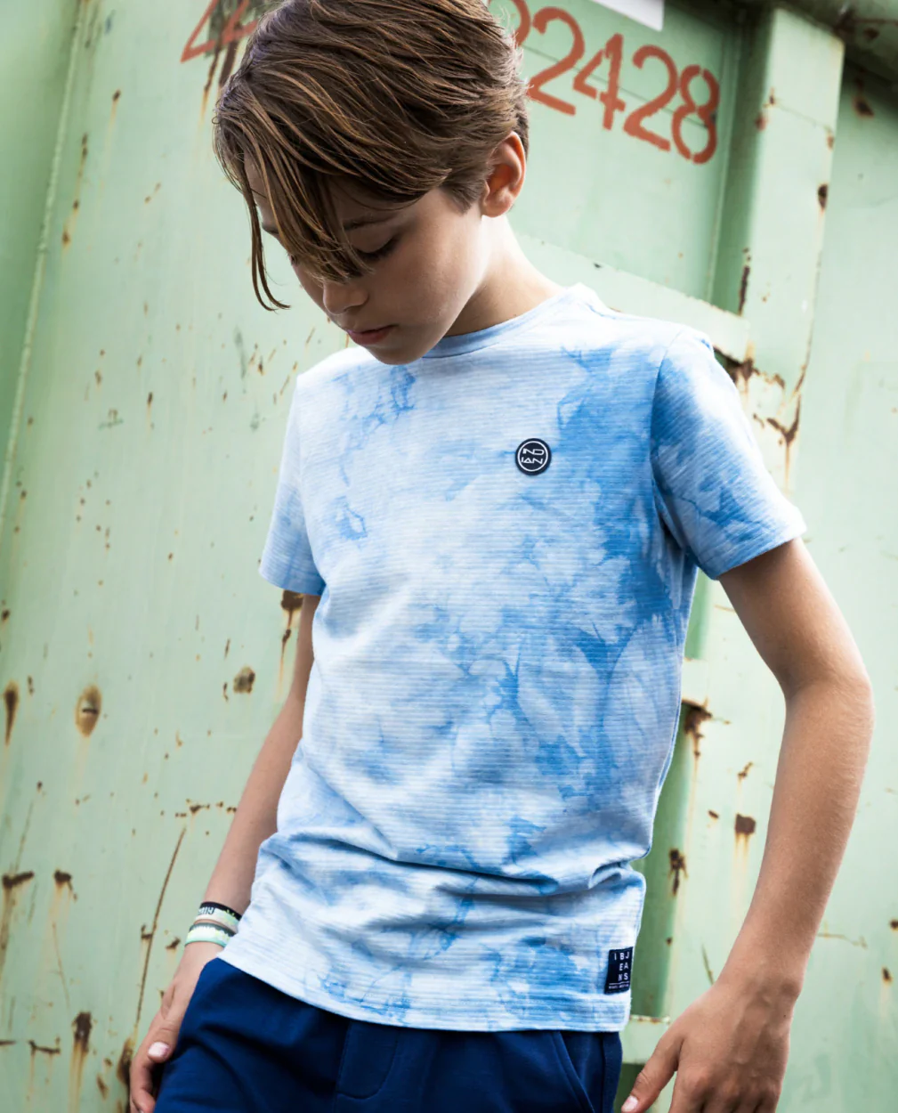 TIE DYE POUR ! Ce t-shirt chic pour garçons a un imprimé tie-dye bleu intégral avec une coupe et une couture cool sur le côté. Le t-shirt a une section logo sur la poitrine. Numéro d’article 3604Couleur: 519