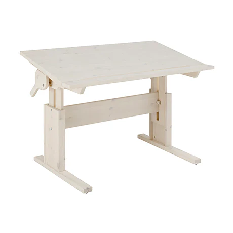 Un bureau en bois massif qui grandit avec l’enfant. La hauteur est réglable de 56 à 78 cm. La platine peut également être inclinée à 0, 10 et 20 degrés pour être également ajustée de manière ergonomique si cela est préféré. La barre avant reste horizontale à tout moment et lorsque la table est inclinée, elle crée un bord qui maintient les livres et les feuilles de papier en place.