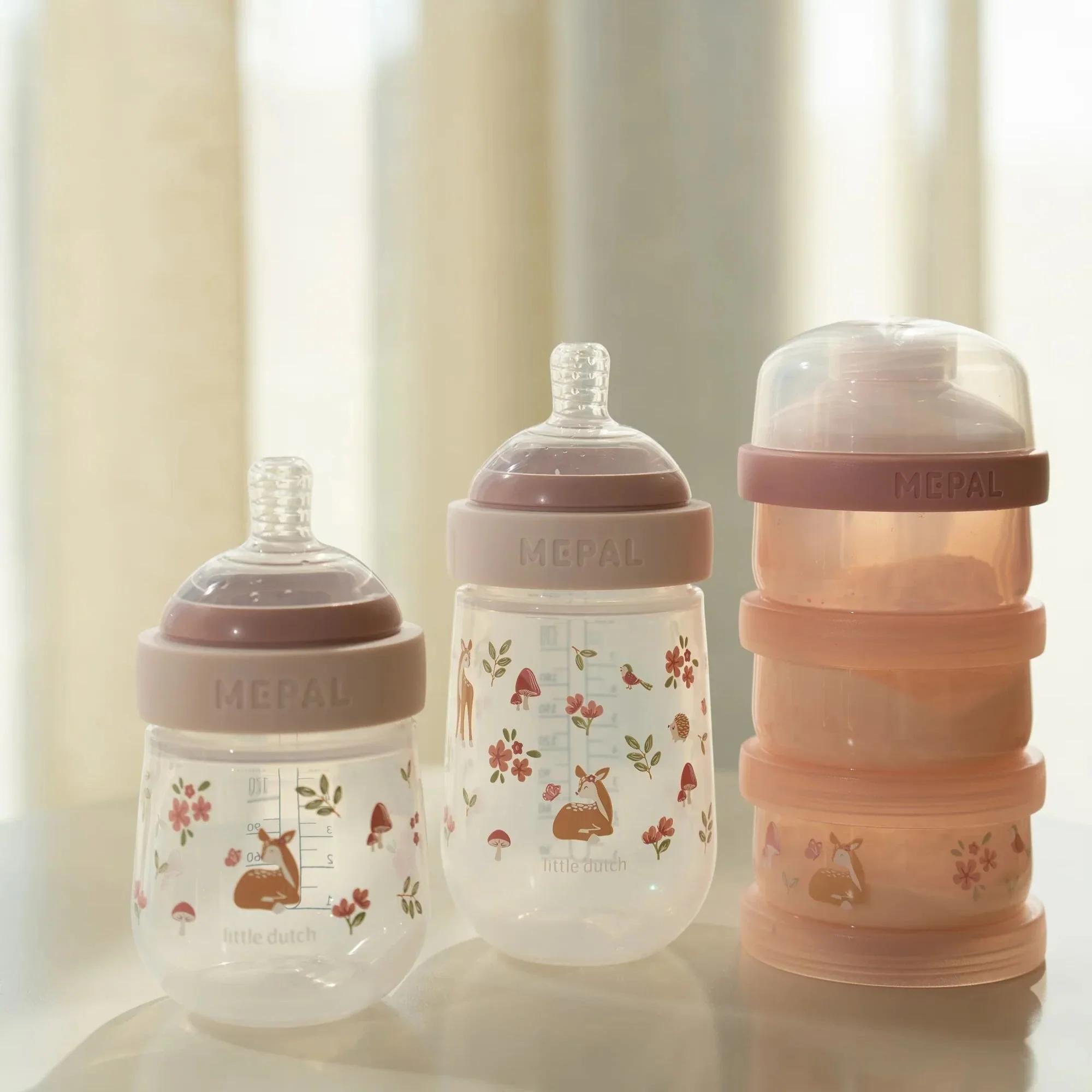 Le kit de démarrage pour biberons Mepal Mio de Little Dutch Orné du charmant motif « Frairy Garden », il allie fonctionnalité et design élégant. Il comprend deux biberons ergonomiques (165 ml et 240 ml) dotés de tétines en silicone souple et d’un débit moyen pour une tétée confortable. La valve anti-colique intégrée minimise l’ingestion d’air et prévient ainsi les crampes d’estomac. La conception spéciale en spirale de la tétine prévient les blocages et favorise un comportement de tétée naturel : idéal pour un début de sevrage en douceur et sans souci.