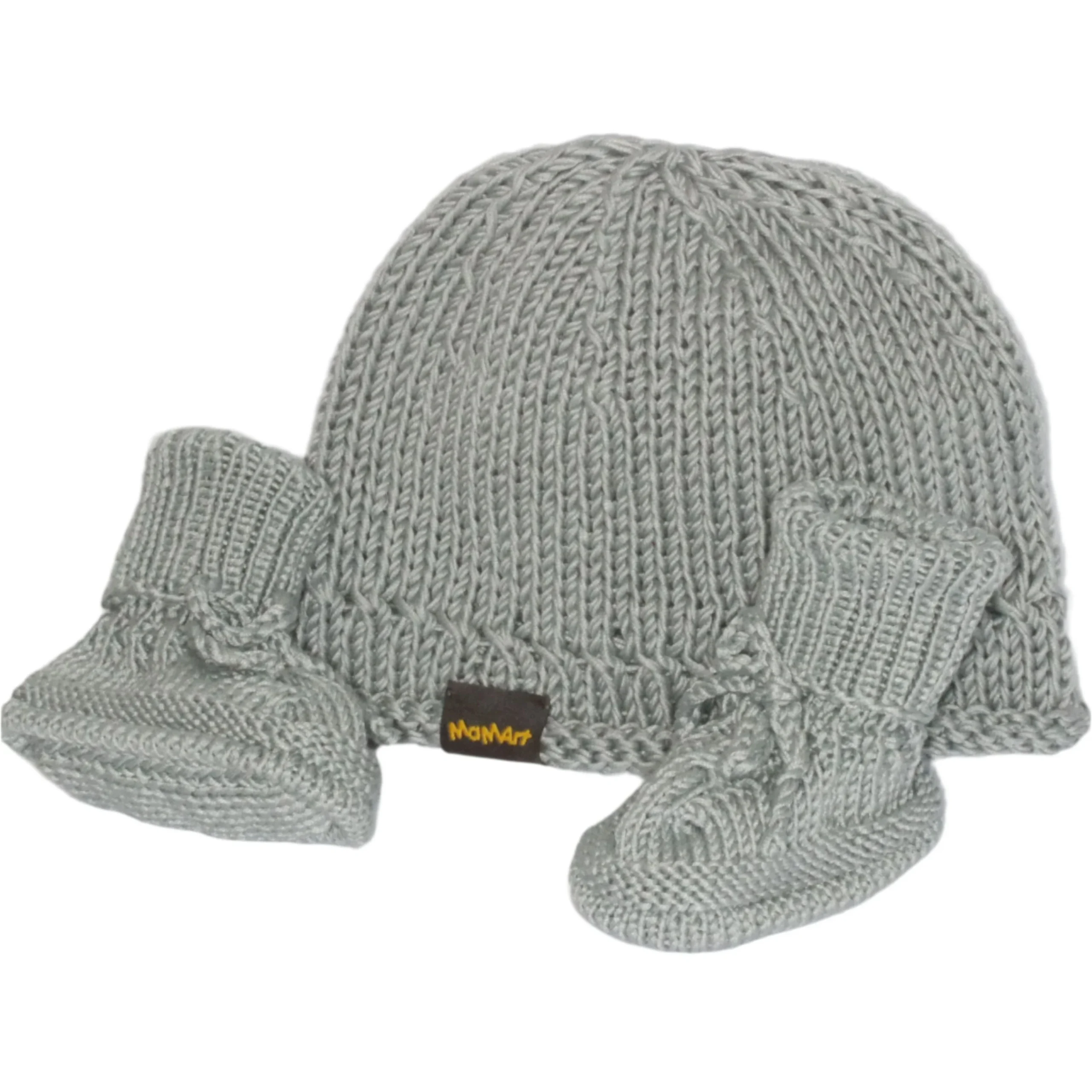 Charmant coffret cadeau de naissance pour fille ou garçon du label suisse MaMArt, composé d’un bonnet tricoté main et de pinsons tricotés main.