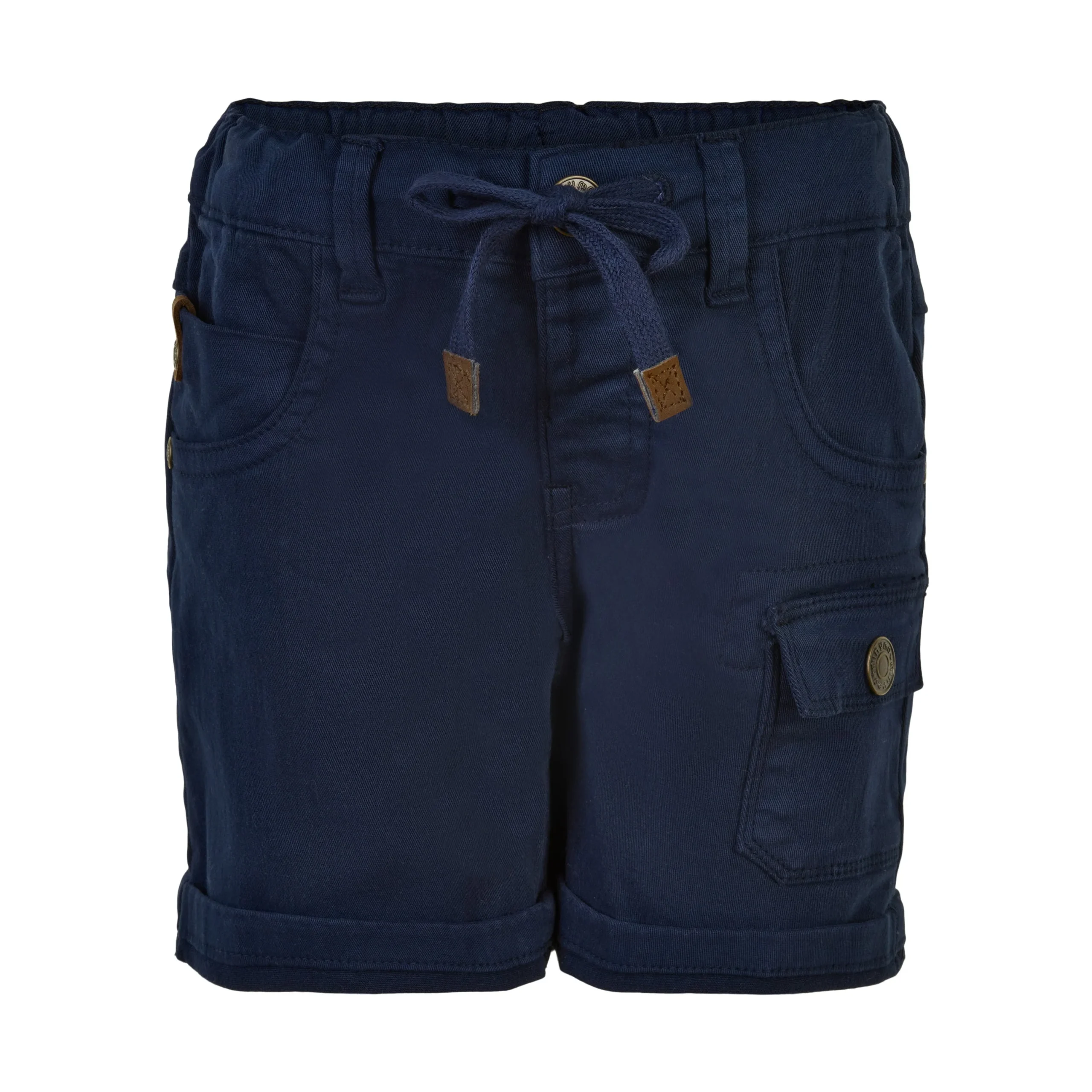 Short en sergé bleu foncé de Minymo avec une taille élastique ajustable à l’intérieur, un cordon de serrage et une fermeture à pression avec des poches à l’avant et à l’arrière.