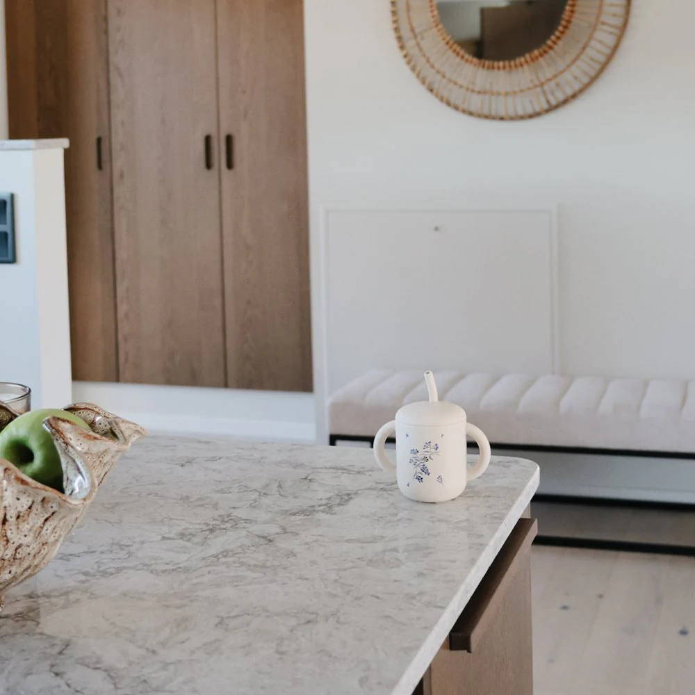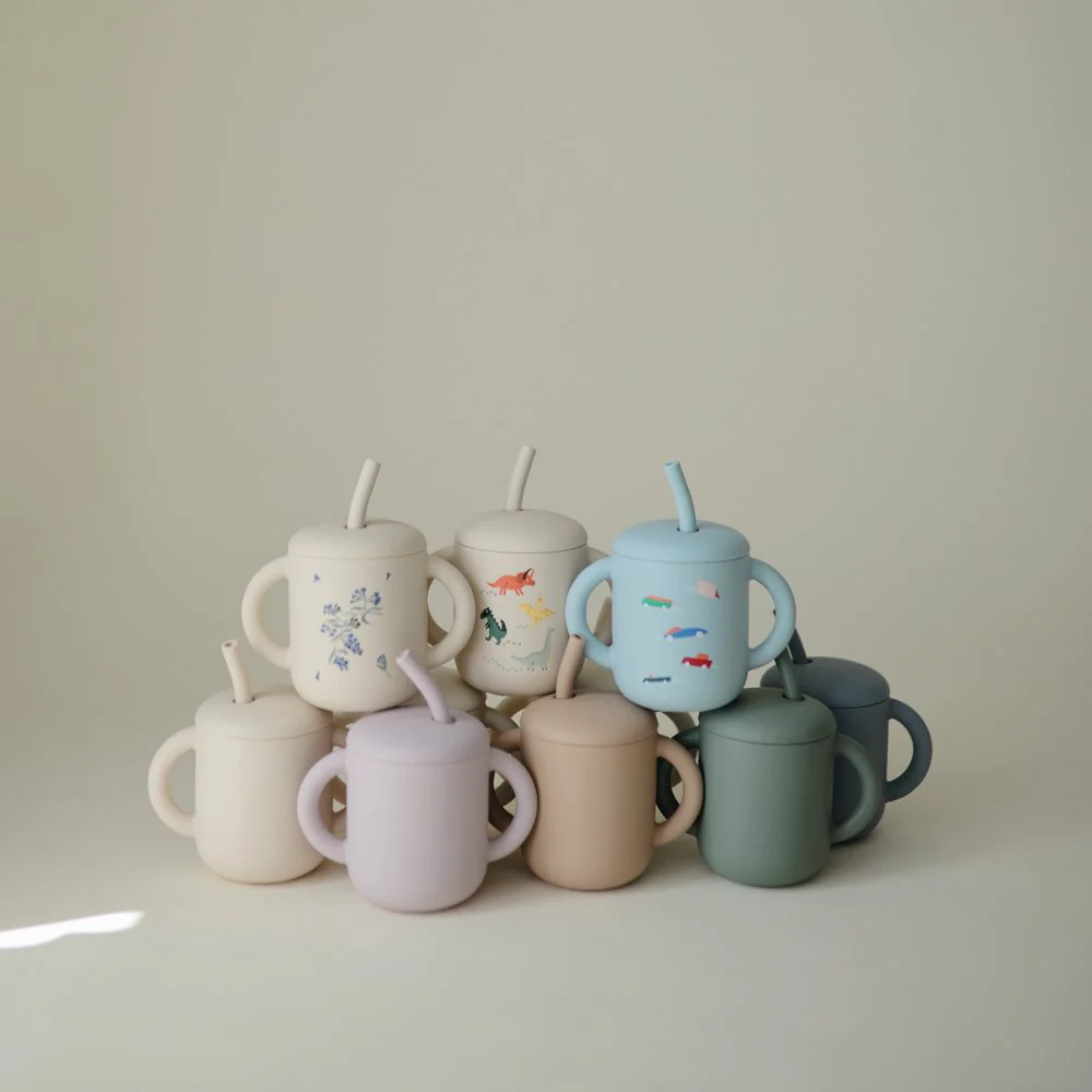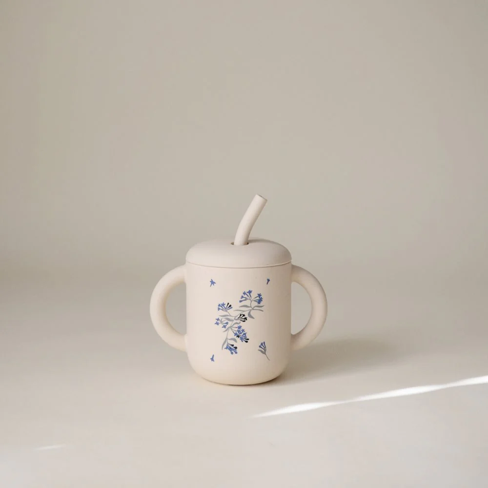 Mushie – Gobelet d’apprentissage en silicone avec paille, motif fleurs de lilas