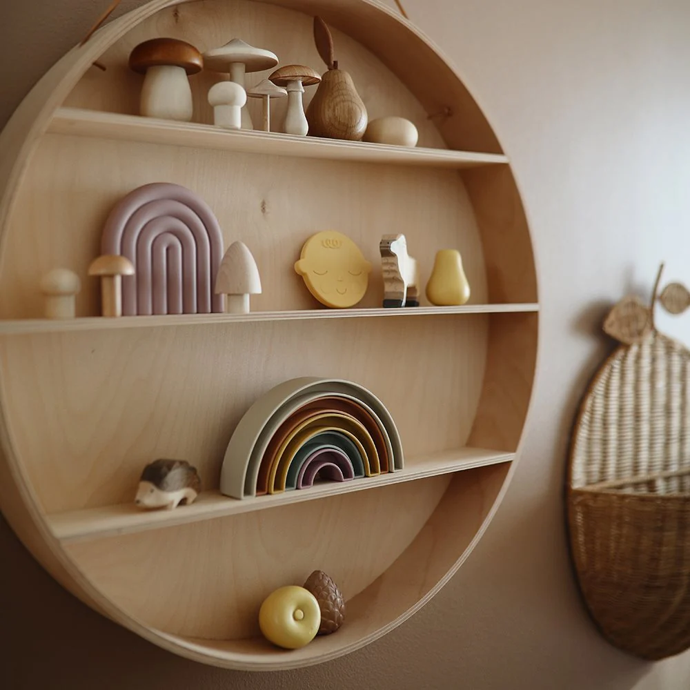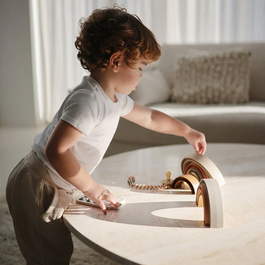 Jouet à emboîter Mushie Rainbow Tropical de la collection Hygge pour les enfants de 10 mois à 3 ans en forme d’arc-en-ciel, inspiré du Rainbow Skywalk à Aarhus au Danemark. Avec le joli jouet à brancher aux couleurs douces, les enfants entraînent de manière ludique la motricité fine et développent leur coordination œil-main et leur motricité globale.