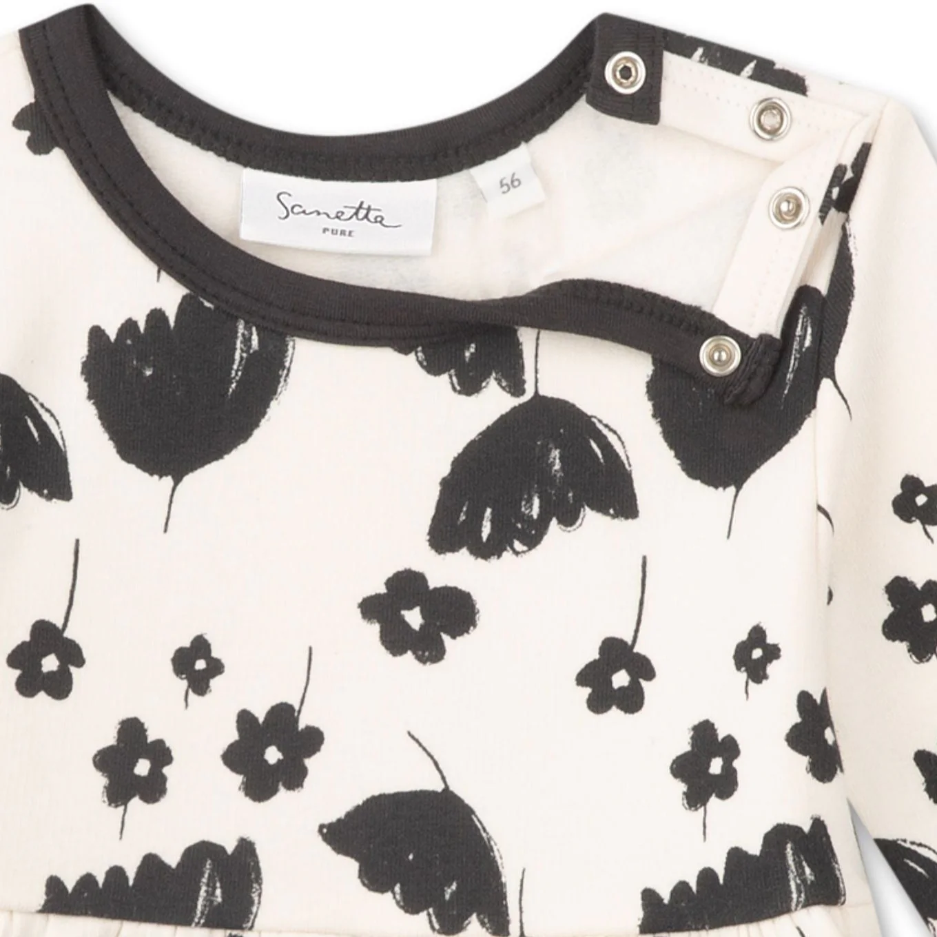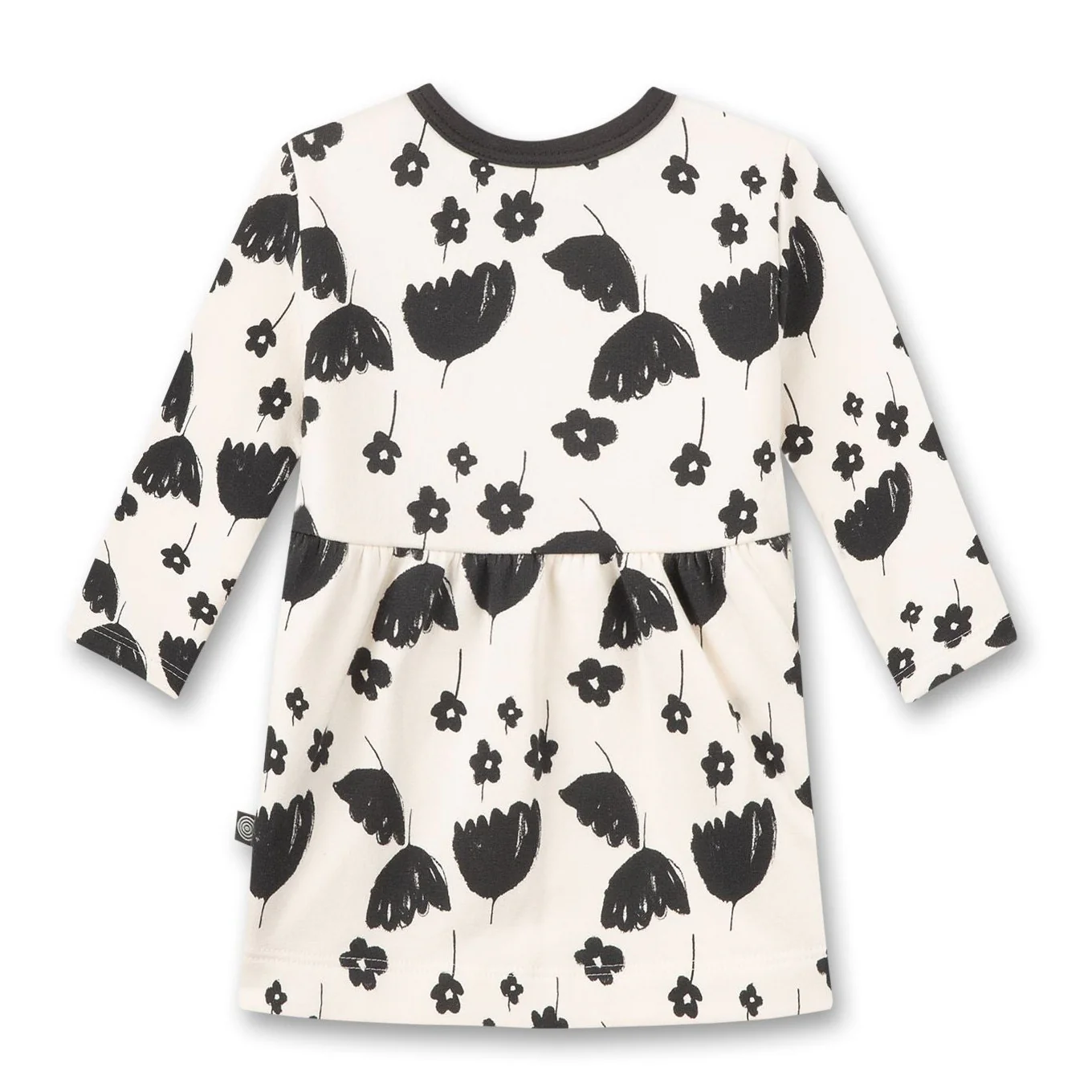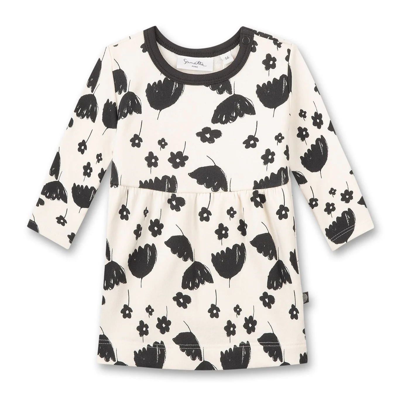 Robe sweat douillette pour fille de Sanetta Pure en blanc cassé avec un charmant imprimé all-over de fleurs gris foncé de la collection anniversaire Sanetta.